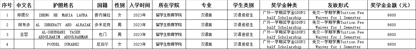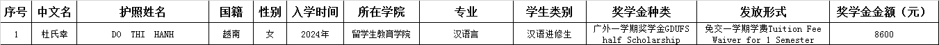 【备注】如有未能报到者或未交齐所需材料者将取消奖学金资格,并将会由候补人选替换。如有异议,请在公示期间(2024年8月26日-2024年8月29日)联系:0086-20-36207141或 iie@gdufs.edu.cn。