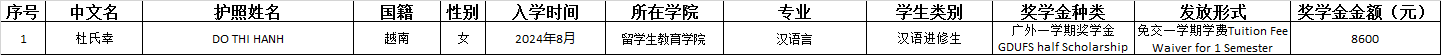 2024年广东外语外贸大学优秀汉语进修生-新生奖学金获奖名单