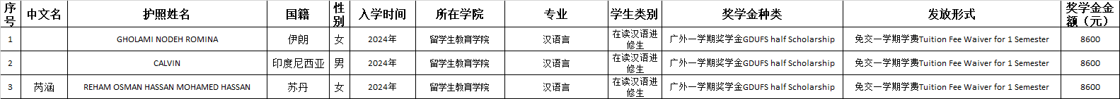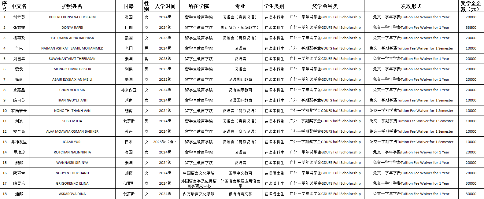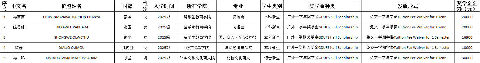 *备注:如有未能报到者或未交齐所需材料者将取消奖学金资格,并将由候补人选替换。如有异议,请在公示期间(2025年09月05日-2025年09月12日)联系:0086-20-36207141或 iie@gdufs.edu.cn。
