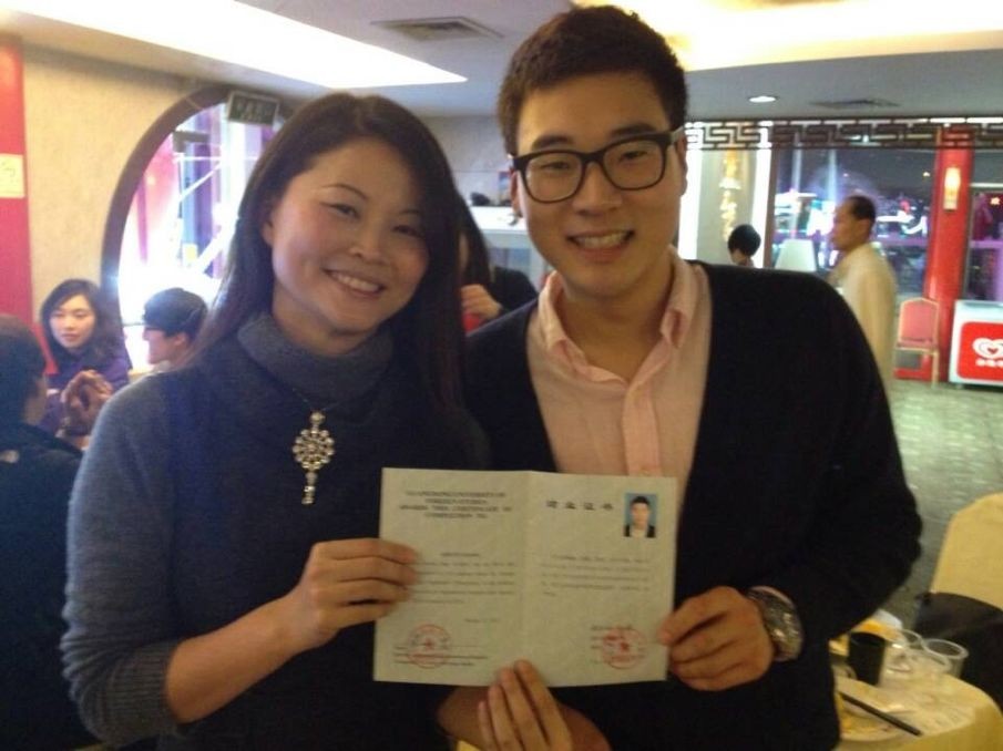 对外汉语教师吴磊为韩国学生颁发结业证书