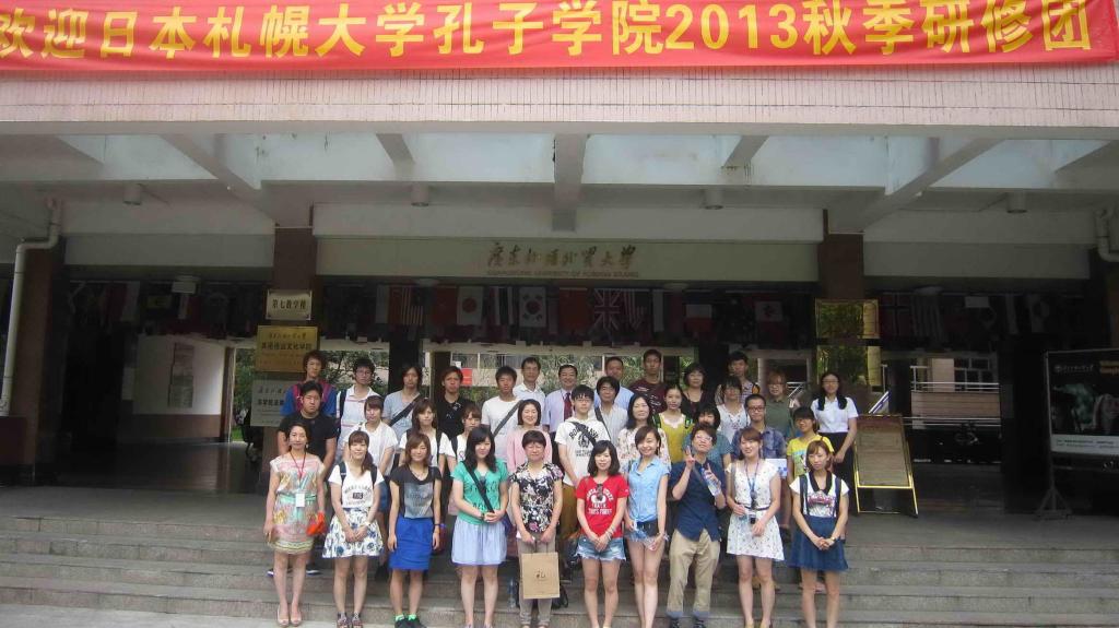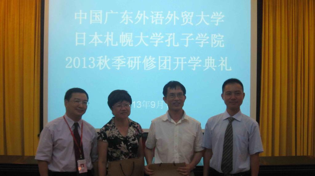 9月1日上午,日本札幌大学孔子学院2013秋季研修团的全体团员参加了开业典礼,日本札幌大学孔子学院日方院长张伟雄,日本札幌大学孔子学院中方院长潘洁敏,我校国际交流处处长吴俊峰,留学生教育学院院长梁学宏出席了开业典礼。典礼上,吴俊峰处长和梁学宏院长分别为此次的札幌大学孔子学院研修团来华之旅致欢迎词,张伟雄院长也对团员们提出了此次研修之旅的学习目标,并鼓励团员们好好珍惜此次来华学习的机会。两位日本学生代表也上台发表了自己对学习汉语的感想和对未来的展望。