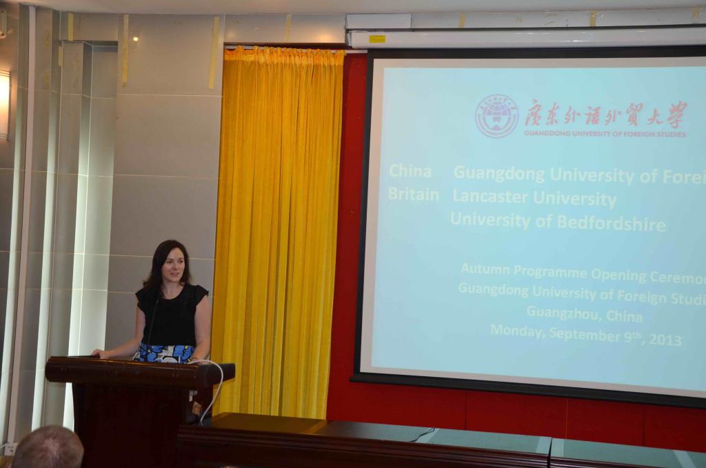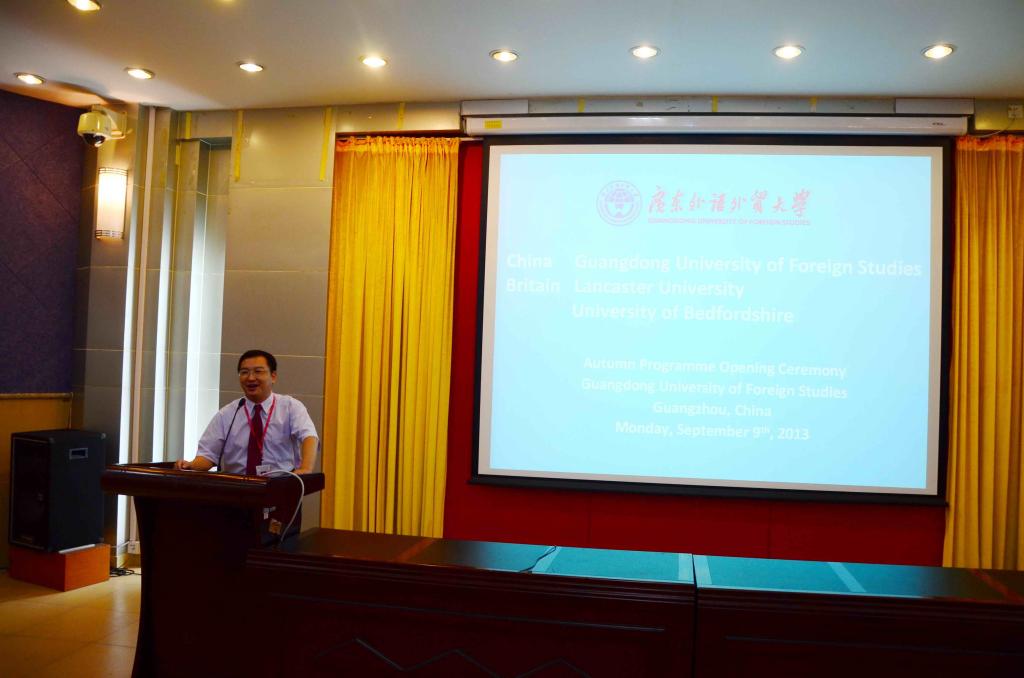 留学生教育学院院长梁学宏首先致辞,他热烈欢迎兰卡斯特大学和贝德福特郡大学研修团的师生来到我校参加为期两周的学习、参访和实习活动。梁学宏详细介绍了我校的发展沿革、理念与人才培养模式,重点介绍了我校国际化发展战略以及对外合作交流的实施情况,特别介绍了我校与兰卡斯特大学的多年紧密的合作交流关系。此外,梁学宏还介绍了广州和广东在中国改革开放中所处的重要地位。梁学宏希望英国师生们充分利用这次研修的好机会,多读,多看,多思,多谈,多写,亲眼目睹真实的中国,亲身感受快速发展中的中国。英国两所学校的领队老师和学生代表随后发言,期望能在未来两周的研修、参访和实习活动中收获知识,增长见闻,广交朋友。