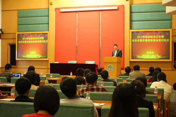 本网讯11月25日,2014年国家级项目申报动员布置会暨校级基地签约仪式在北校国际会议厅举行。校长仲伟合,各学院院长,教辅单位负责人,科研副院长,科研机构负责人,校级科研创新团队项目负责人,校级基地负责人,科研秘书,科研处全体人员出席了本次会议。会议由副校长顾也力主持。