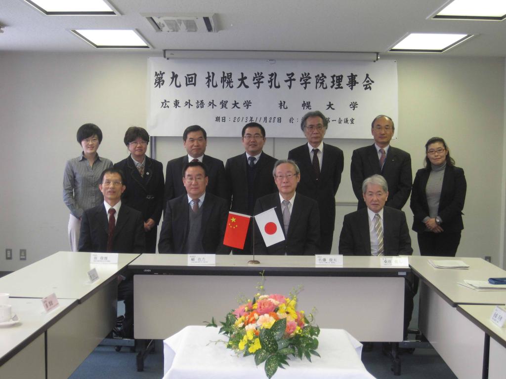 11月28日上午,顾也力与札幌大学理事长佐藤俊夫、校长桑原真人等共同出席了札幌大学孔子学院第九届理事会会议。理事会审议和讨论了2013年度札幌大学孔子学院事业报告、2013年度汉办项目经费补助说明、2013年度日本孔子学院协议会报告、2014年度事业计划及预算案、中方教师派遣等。下午,顾也力出席了札幌大学教育改革座谈会,札幌大学副校长本间雅美、山田玲良等一同出席。在会上,两校领导分别介绍了学校因应经济全球化和教育国际化趋势所作出的战略调整和改革,并就国际化战略、学科调整、综合性人才培养、区域共创等问题进行了热烈讨论。