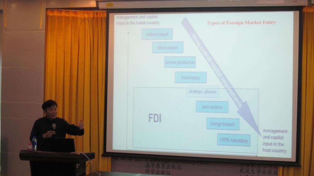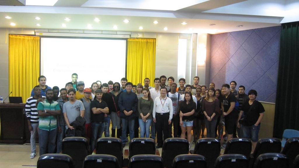 李永宁教授重点以中国企业为例,分析了中国企业走出国门的发展过程以及不同阶段的主要形式,从80年代的加工贸易、补偿贸易和出口中介贸易,发展到如今的服务外包、离岸贸易、以及建立跨国公司进行兼并收购等等,形态多样,与时俱进。李教授为外国留学生全面阐述了企业全球化的策略和步伐,深入浅出,形象生动。