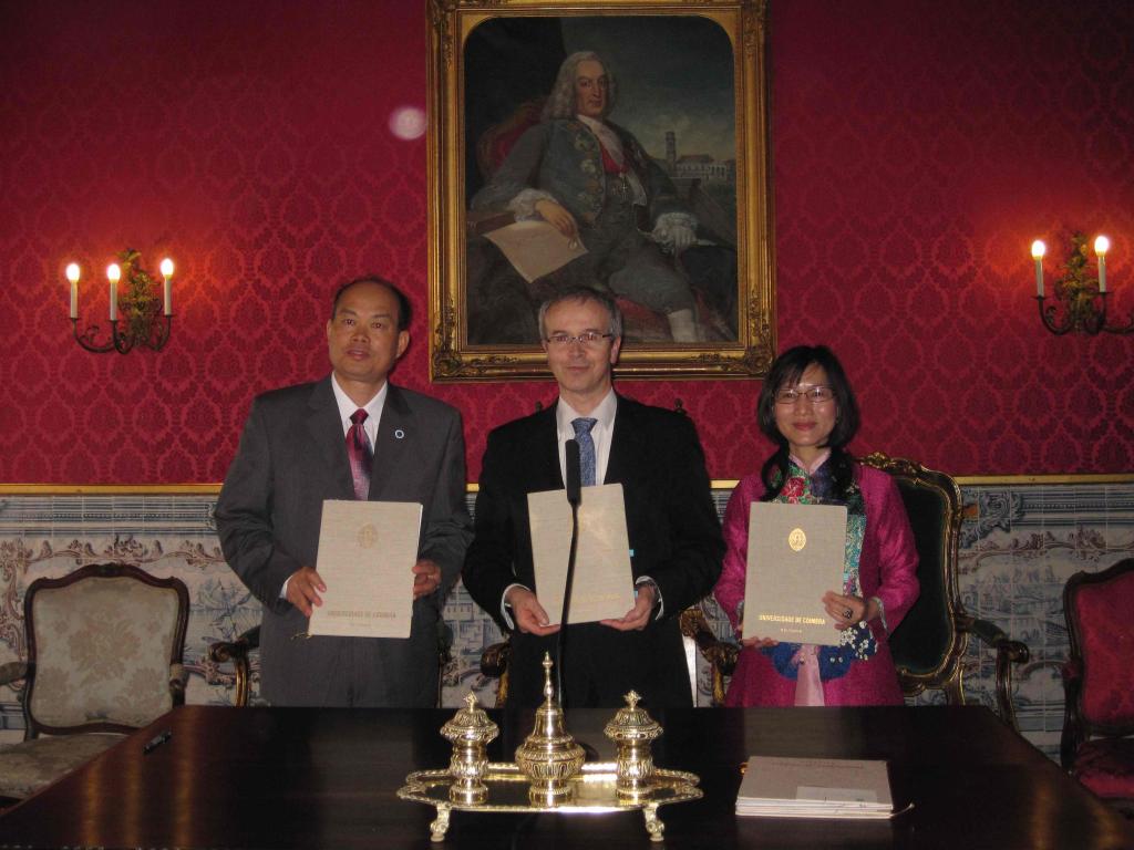 5月19日,我校代表团访问了葡萄牙科英布拉大学。科英布拉大学校长若奥·加布里埃尔·席尔瓦(Joao Gabriel Silva)、副校长若吉米·拉莫斯·德·卡瓦洛(Joaquim Ramos de Carvalho)、副校长玛格利达·曼诺(Margrida Mano)等亲切会见了代表团。席尔瓦校长介绍了科英布拉大学,指出该校是葡萄牙历史最为悠久的大学,在13世纪到17世纪的500年中,作为唯一一所在全世界推广葡萄牙语的机构,对促进葡萄牙与其他国家的交流起了不可替代的作用。科英布拉大学重视与中国的高校加强合作,希望能在科英布拉大学、澳门理工学院、广东外语外贸大学三方的合作下,在中国内地建立葡语硕士专业的教学,培养葡语高级人才。