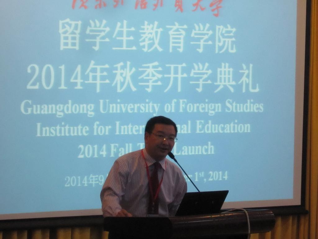 在王一仟对出席的嘉宾和老师进行简短的介绍后,梁院长分别用汉语和英语致辞。他首先对全体新同学的到来表示热烈的欢迎,简要介绍了我校的基本情况和发展战略目标,并重点介绍学院今年特色品牌活动——第六届世界文化节,鼓励新同学发挥自己的特长,参与到活动中。接着,提到了当前全世界都极度关注的埃博拉出血热情况,他说中国政府已经密切跟进病毒情况,并会保护好每一位在华的外国人,如有外国人在中国不幸染上该病情,中国政府一定会免费为患者提供医院援助。梁院长还提到了中国梦,中国正致力于实现国家富强、民族复兴、人民幸福的伟大目标,他希望在座的每一位留学生,都能亲眼亲身地去感受在中国的生活,同时实现自己的梦想。最后,他祝愿全体外国留学生在我校学有所成、身体健康、生活愉快。