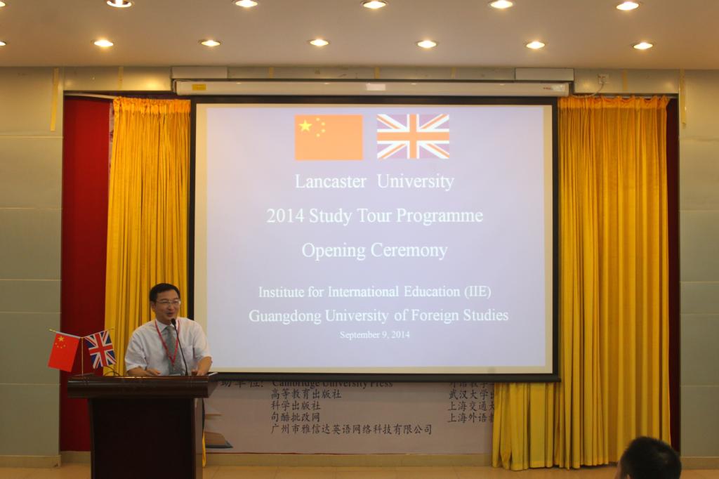 留学生教育学院院长梁学宏首先用英语致欢迎辞。他从广外与兰卡斯特大学之间的合作开始,阐述了我校与兰卡斯特大学源远流长的交流历史。他还介绍了广外的校区、学生和教职工等基本情况,他特别提到大学教育国际化战略,并认为兰卡斯特大学学生的到来增添了大学的国际化特色。然后,他向大家简要介绍了广州的基本概况,广州是中国最早对外开放的城市,是海上丝绸之路的发源地,也是举办广交会的总部,他鼓励大家抓住机会在广州多玩玩多开开眼界。最后,他预祝学生们在未来的日子里能够有所收获,广交朋友。