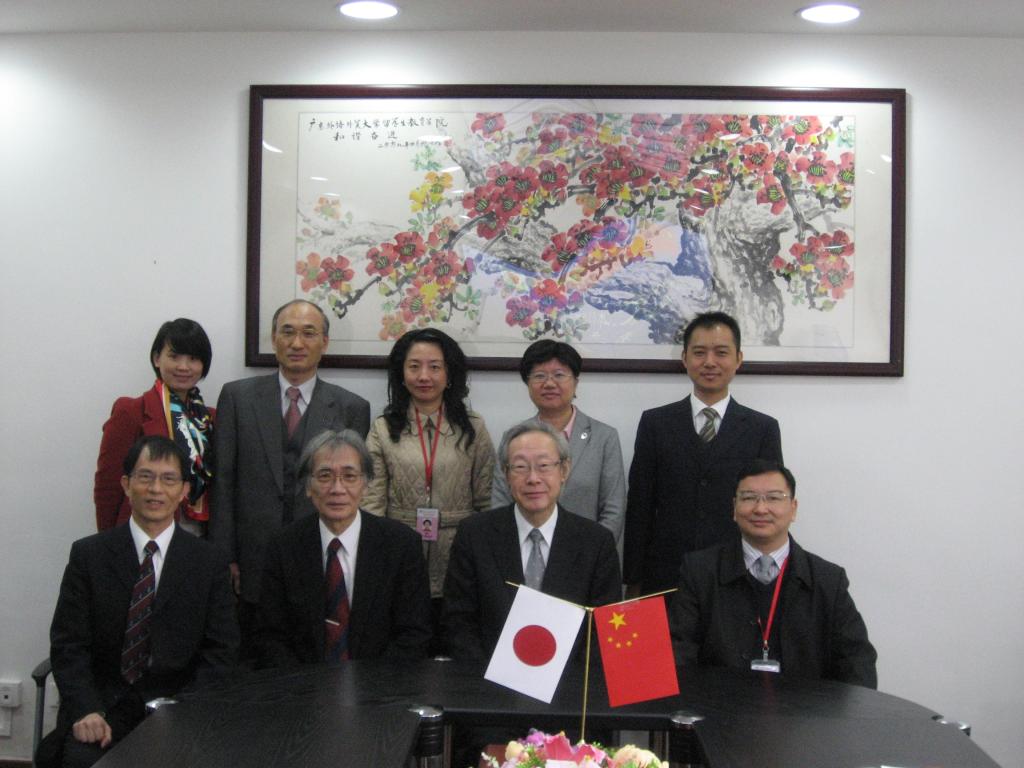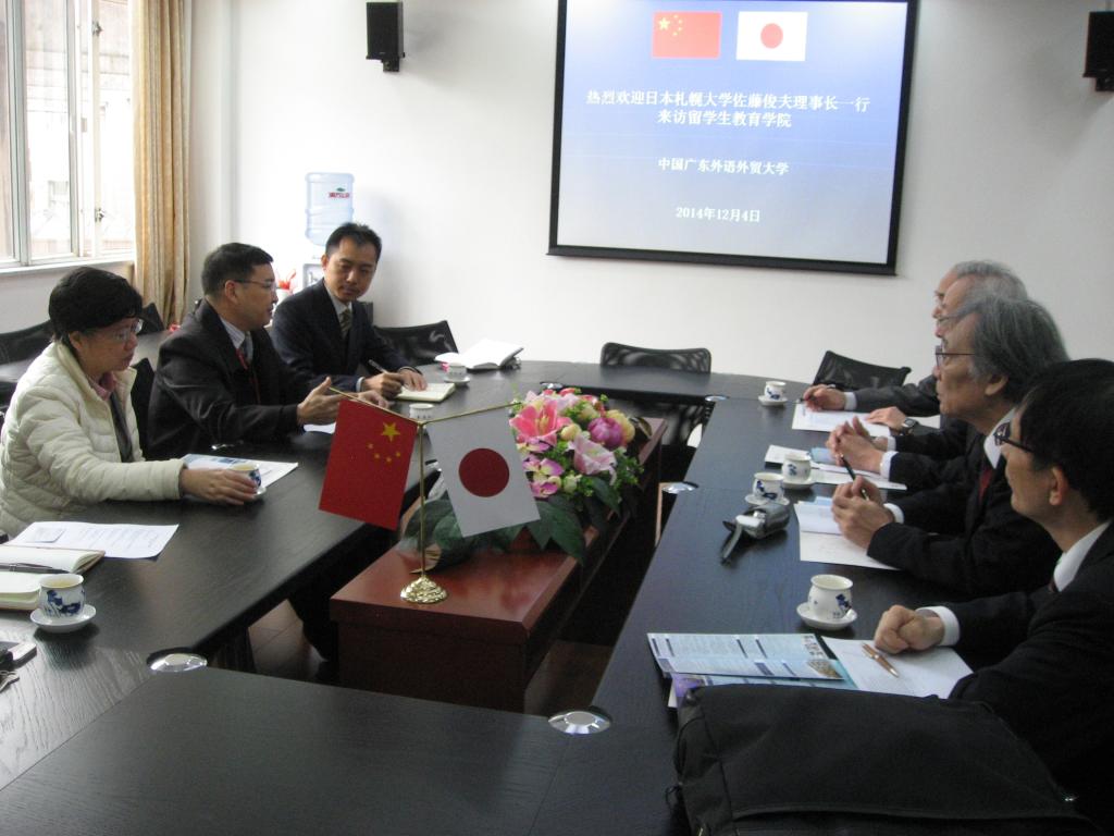 12月4日,日本札幌大学理事长佐藤俊夫(SATO TOSHIO)、理事金城(KANESHIRO HIDEKI)、孔子学院院长张伟雄、札幌大学孔子学院事务局长加清真二(KASE SHINJI)来访我校,校长仲伟合在北校区行政楼贵宾厅会见来宾,国际处处长蔡红、东语学院院长陈多友、留学生院院长梁学宏、札幌大学孔子学院中方院长潘洁敏等出席会见。