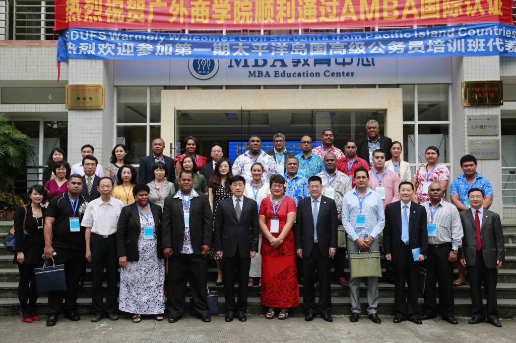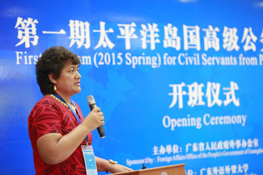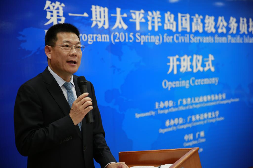 傅朗主任首先代表省外办致辞。对首批24名来自斐济、萨摩亚、汤加和密克罗尼西亚的高级公务员表示热烈欢迎,他对我校富有成效的承办工作表示感谢。他指出本月底广东省领导将率团赴该地区的岛国访问,进一步推动广东与各国在各领域的务实合作,此次培训班的举办可谓恰逢其时。他鼓励学员共同为中国今后与太平洋岛国开展务实共赢合作打下坚实的基础,在两国两地人民心间播下友谊的种子。当傅朗特别提出由广州飞往斐济的直航即将开通时,全体学员爆发出热烈的掌声。