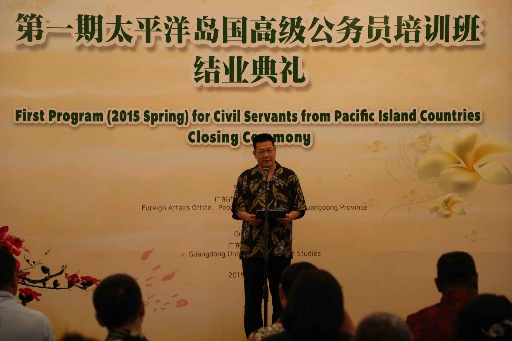 傅朗代表培训班主办单位致辞。他高度赞赏全体学员在培训过程中勤学务实、好问乐思,而且善于将广东的所见所闻,与本国的发展、两地之间的交流合作结合。他特别提到,近日广东省委书记胡春华率领的代表团访问了斐济,同期访问的广东文艺分团还顺访了萨摩亚,广东医疗分团也到访了汤加,广东与太平洋岛国的友好交往进入了一个崭新的阶段。