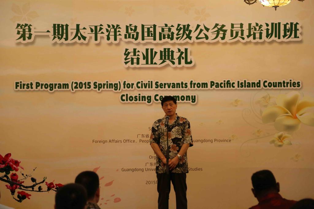 广东省人民政府外事办公室主任傅朗、副主任苏才芳,广东省人民对外友好协秘书长李宏志、副秘书长杜月,广东外语外贸大学校长仲伟合、副校长方凡泉,国际合作与交流处处长蔡红,留学生教育学院院长梁学宏、副院长吴艳等领导出席。典礼由苏才芳副主任主持。培训班首批24名来自斐济、密克罗尼西亚、萨摩亚和汤加的高级公务员出席结业典礼。