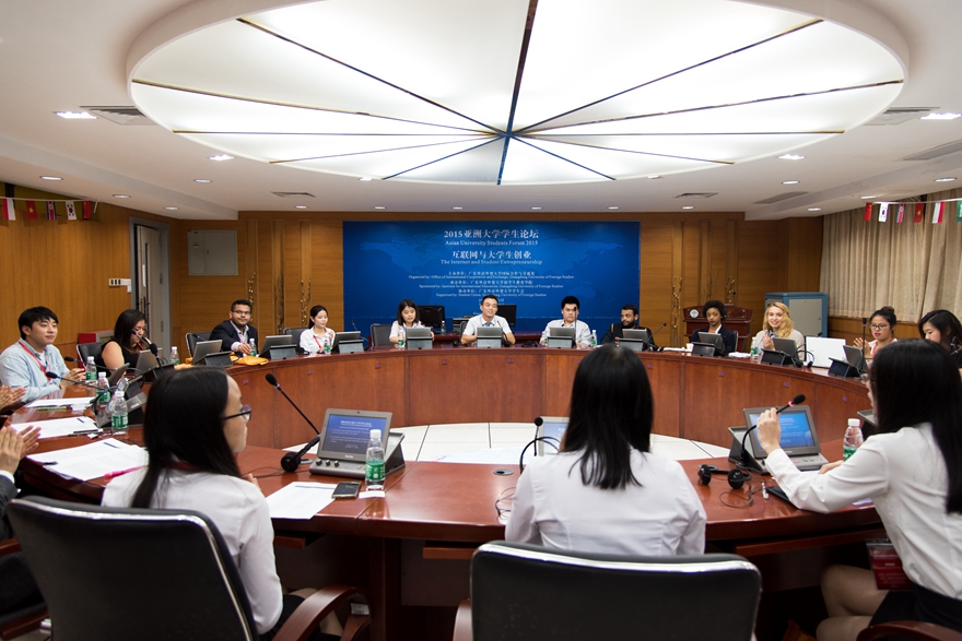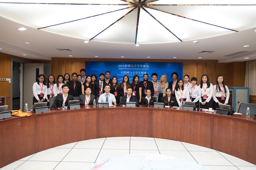 本网讯 11月5日晚,2015首届亚洲大学学生论坛在北校区六教会议室举行。我校学生会副主席曹维明、18位来自水仙国际大学(孟加拉国)、马哈沙拉堪大学(泰国)、东西大学(韩国)和釜山外国语大学(韩国)和我校东语学院各语种、留学生学院的学生代表就“互联网与大学生创业”这个议题展开讨论。