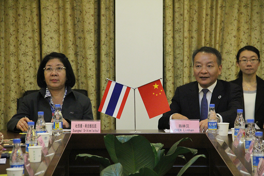 中国驻清迈总领事馆副总领事王秀胜、广东省人民政府外事办公室新闻处副处长朱春虹,我校国际处处长蔡红、留学生教育学院院长梁学宏、东语学院党委书记杨敏生、东语学院副院长罗奕原、泰语系主任廖宇夫等陪同会见。