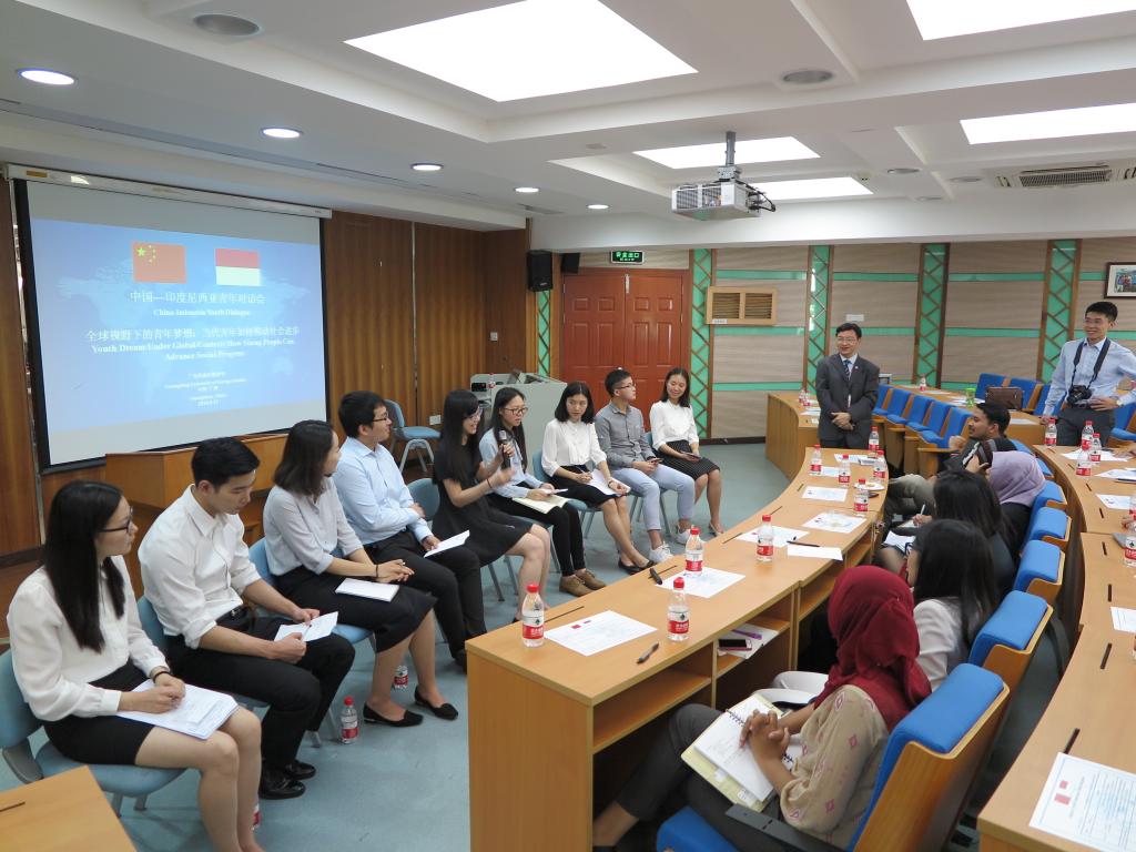 讲座结束后,青年对话会正式开始。主持人梁学宏院长以梦想为切入点,引导两国学生就“全球化下的青年梦想-如何推动社会进步”的主题一步步深入展开对话,印尼和我校学生畅所欲言,共同剖析两国发展中存在的问题和解决的对策与措施,并表示两国青年应该像今天对话会一样能够经常面对面交流,沟通思想,促进两国友好合作。