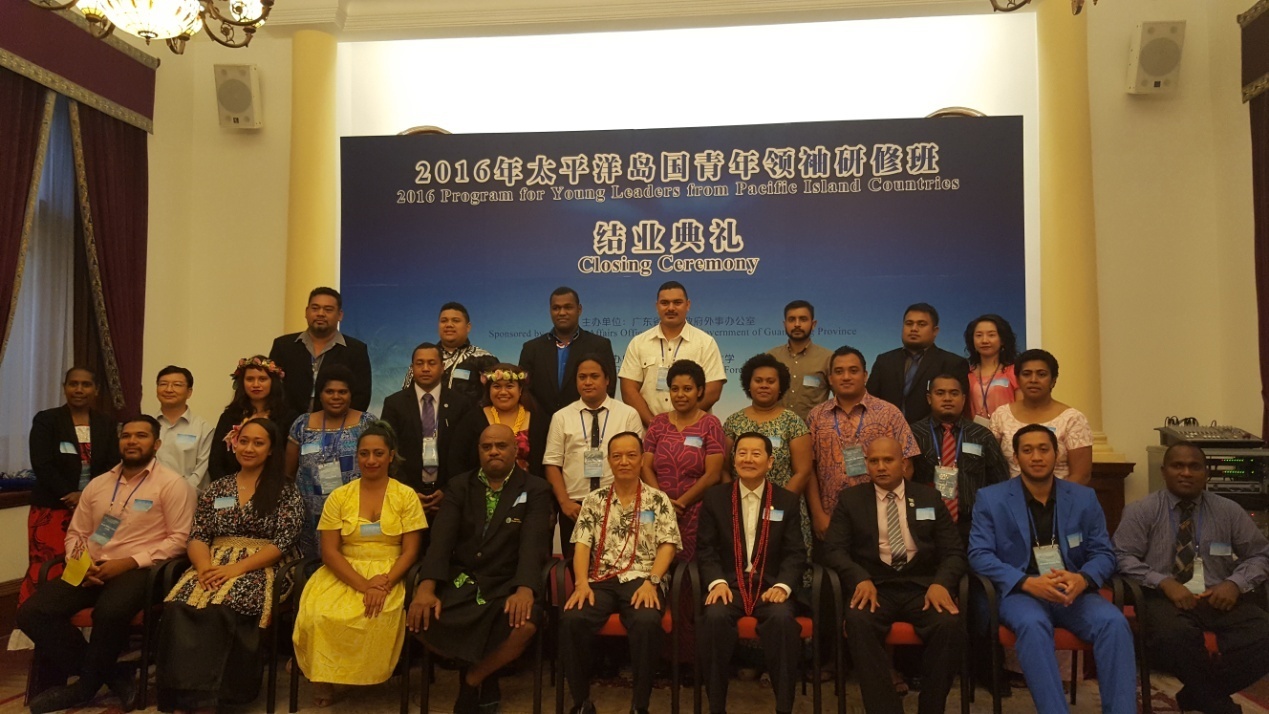2016年6月7日下午,太平洋岛国青年领袖研修班结业典礼在广东外事俱乐部举行。出席结业典礼的主办单位代表有:广东省人民政府外事办公室(以下简称“省外办”)副主任李坚,综合处副处长郑红梅,主任科员字杨芬。承办方代表有:广东外语外贸大学副校长方凡泉,留学生教育学院院长梁学宏,副院长吴艳,办公室主任周泉等,以及24名来自库克群岛、斐济、密克罗尼西亚、纽埃、萨摩亚、汤加、瓦努阿图的研修班学员。