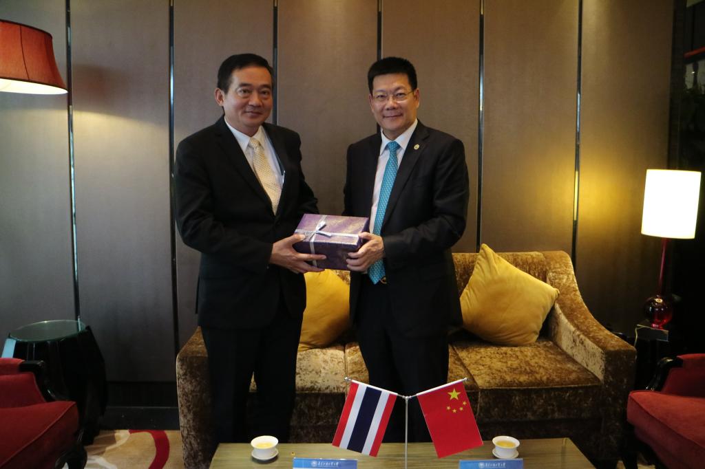 随后,仲伟合在学术交流中心与瓦信•蓝巴替盛一行进行了会谈。瓦信•蓝巴替盛希望我校能加强与泰国名校的合作与交流及与泰国驻穗知名企业的合作,继续支持泰国文化室的建设以及继续合作举办学术研讨会。仲伟合表示,我校愿与泰方一道进一步促进双方在教育、文化等领域的合作与交流。同时也对泰国驻广州总领馆对我校泰语专业一直以来的支持与帮助表示感谢。最后仲伟合代表我校给泰方赠送了礼物,并合影留念。