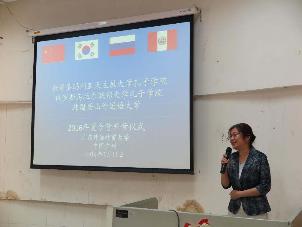 2016年7月10日,秘鲁圣玛利亚天主教大学孔子学院、俄罗斯乌拉尔联邦大学孔子学院及韩国釜山外国语大学2016暑期夏令营开营仪式在第七教学楼110教室举行。留学生教育学院院长梁学宏、副院长王凤兰,秘鲁圣玛利亚天主教大学孔子学院中方院长彭启贵、俄罗斯乌拉尔联邦大学孔子学院中方院长陈辉及64名俄罗斯、秘鲁及韩国学生出席了开营仪式。