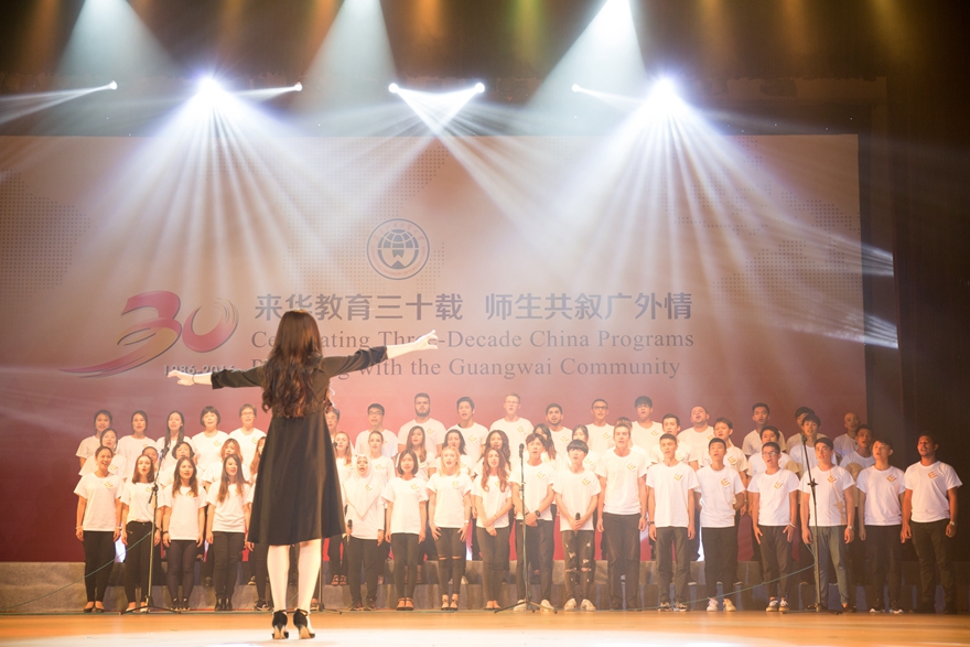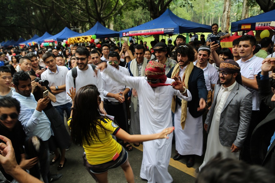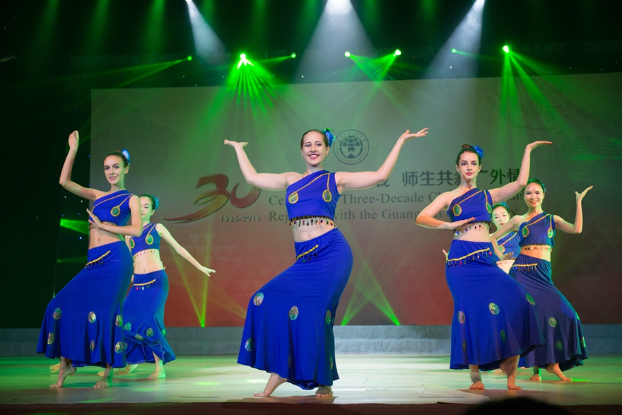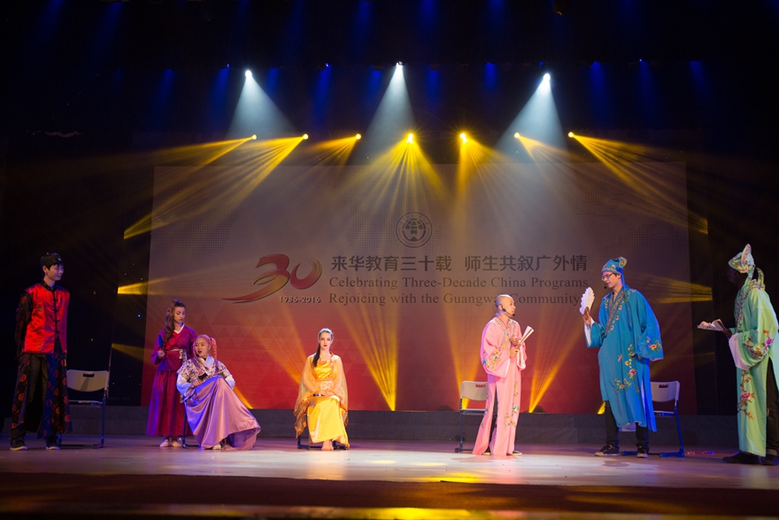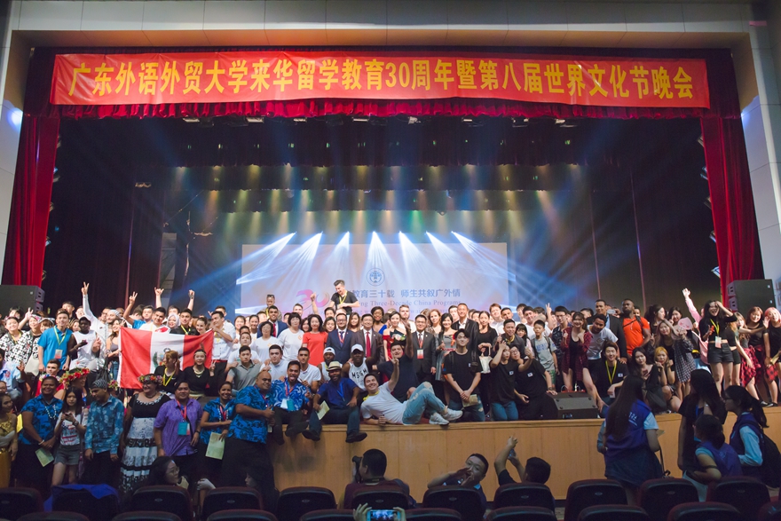 晚上,第八届世界文化节晚会在云山会堂隆重举行。观众一同享受了一场以“来华教育三十载,师生共叙广外情”为主题的世界文化盛宴,各国留学生倾情献演,带来各具民族特色的歌舞表演。