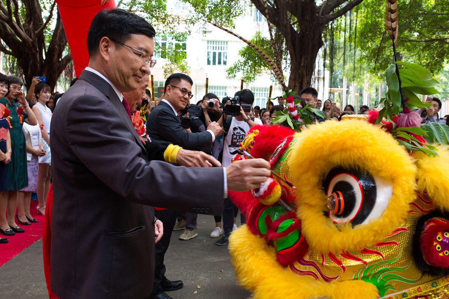 泰国曼谷大学校长助理王达明博士和我校留学生教育学院院长梁学宏为醒狮点睛。梁学宏在锣鼓声中宣布美食长廊正式开幕,醒狮起舞,礼炮齐鸣,在场游客以热烈掌声祝愿文化节顺利开展。