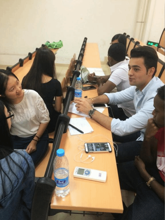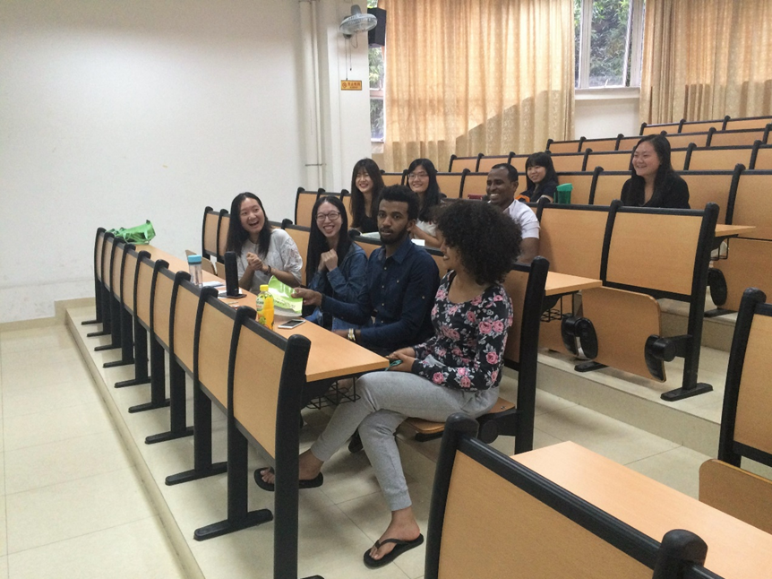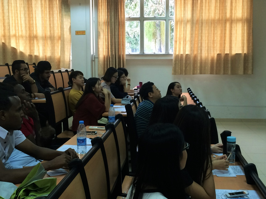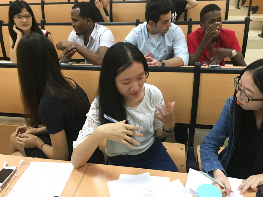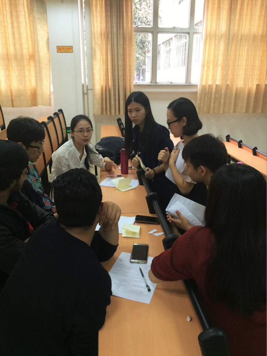 接下来是讨论环节,全场参与者通过抽签被分为正方(爱人更幸福)和反方(被爱更幸福),每一方又被分为2个小组进行讨论。进入讨论环节,同学们抛却了刚认识的生疏感,认真而富有热情地进行了激烈的讨论,滔滔不绝,妙语连珠,贯通中外。大家虽来自不同国家,却因同一个观点产生了思想的凝聚。之后各方综合本方两个小组的观点,再进行交流讨论。
