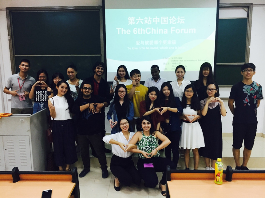 2016年9月29日下午三点,第六站中国论坛(The6thChina Forum)在北校区七教213室举行。来自2016级国际商务(全英教学)、高级翻译学院、英文学院和东方语言文化学院的同学们围绕“爱和被爱哪个更幸福”这一话题展开了激烈的辩论。我校冯小钉老师、吴晨露老师和张弛老师出席本次论坛。