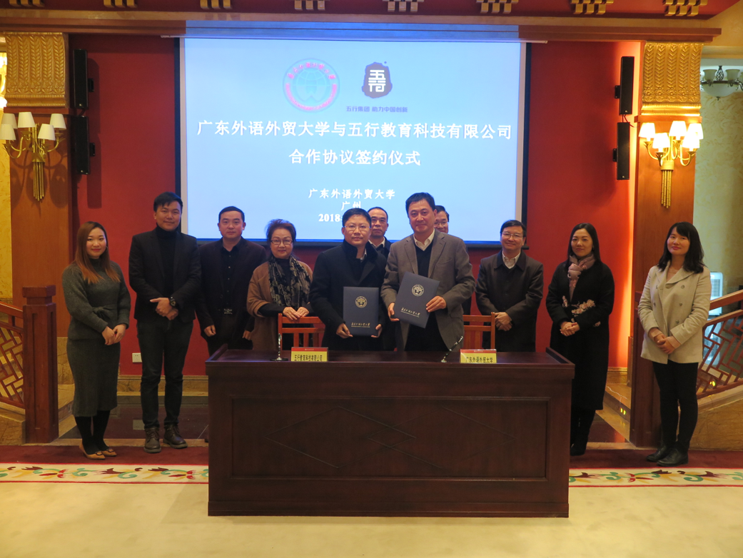 2018年2月5日下午,广东外语外贸大学与五行教育科技有限公司“一带一路”沿线国家专门用途汉语国际人才培养框架协议书签署仪式在我校北校区行政楼贵宾厅举行。