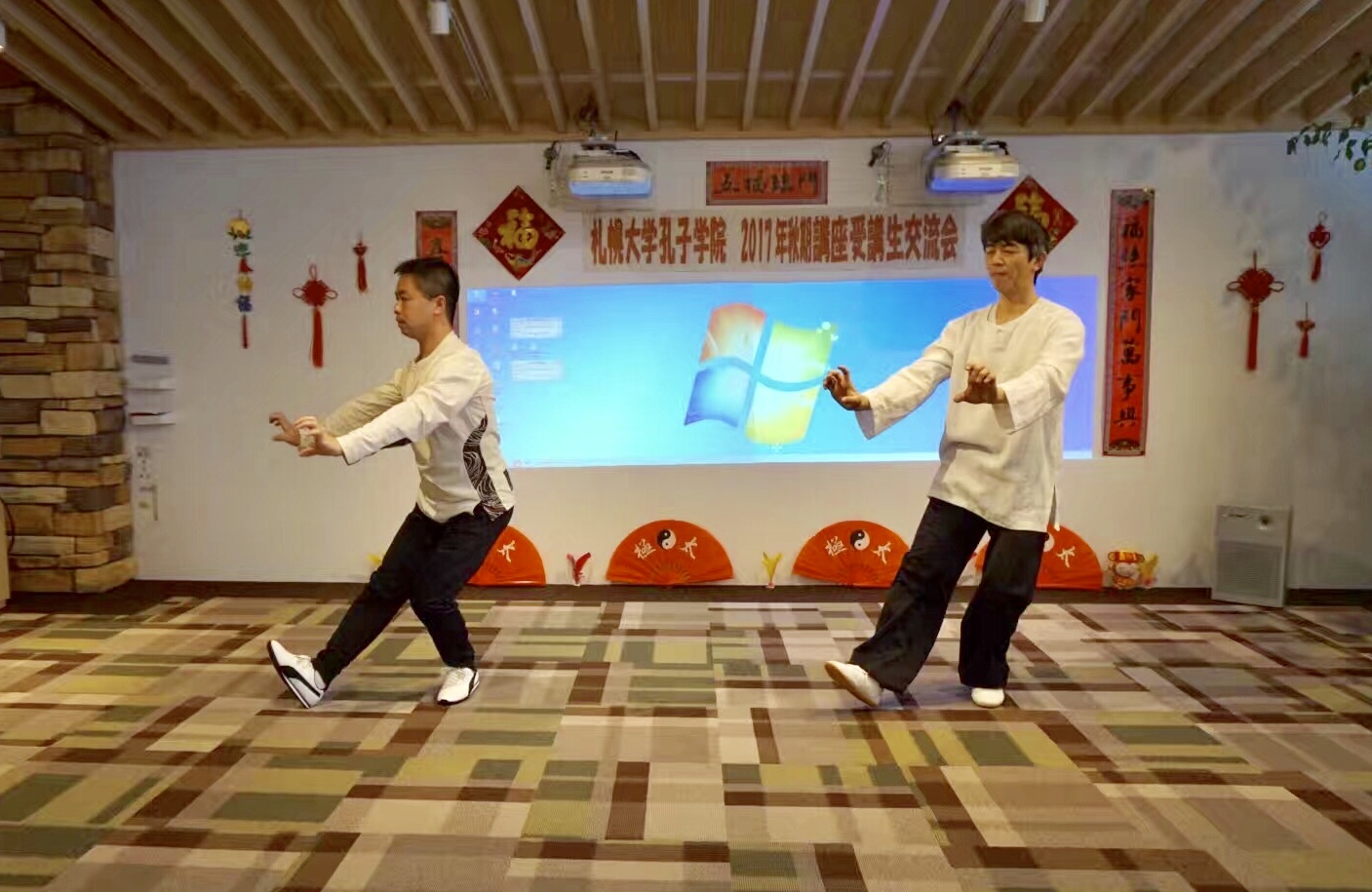 接下来的环节是展示中国功夫表演,由札幌大学访问学者杭州电子科技学院国际教育学院副院长李国冰与札幌大学副校长兼孔子学院副院长泷元同台为学员们献上了五禽戏功法。紧接着,李国冰还随着中国传统音乐表演起乐柔刚并济的太极拳,时慢时快、虎虎生威的拳术表演赢得了阵阵掌声。