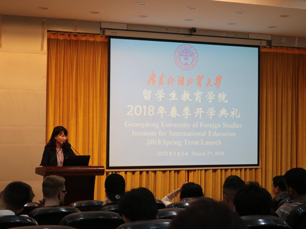 办公室主任周泉作为教师代表讲话。她分享了工作十几年来的经验以及对来华留学教育发展的感受,希望新老学生能积极参与到学院这学期将举办一系列的社会实践活动,在广外体验丰富多彩的学习及课外生活,体会中国博大精深的历史和文化。
