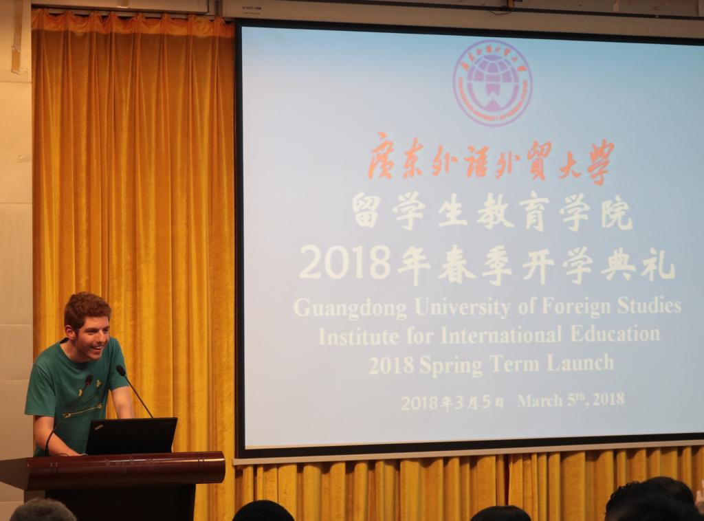 来自的法国巴黎高翻学院交换生马丁BUATOIS MATTI LUCAS XAVIER作为新生代表发言,他说曾经住在中国八年,去过很多城市,但还是感觉自己的汉语水平有待提高。所以这次特意从巴黎交换到广州,努力学习汉语,了解更多中国的历史和文化。