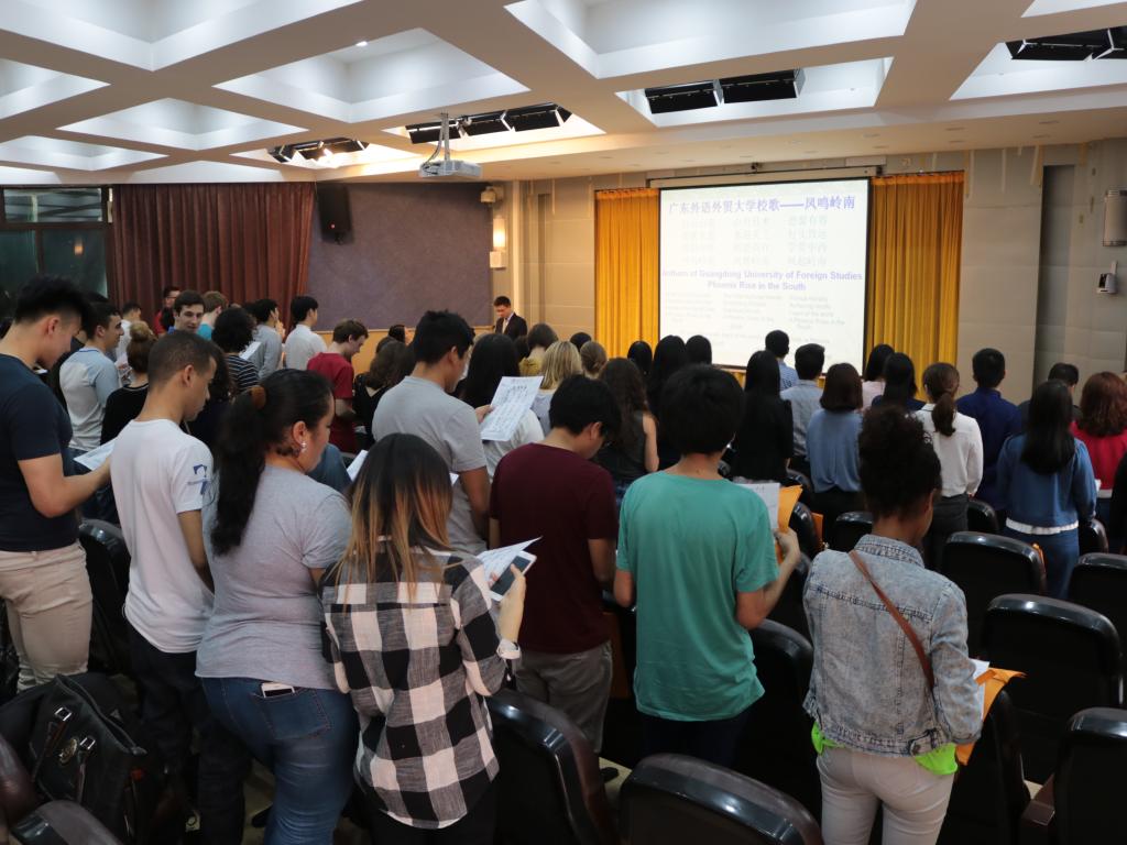 院长梁学宏分别用汉语和英语致辞。他首先对全体新同学的到来表示热烈的欢迎,简要介绍了我校2017年来华留学教育的发展情况,之后重点介绍了学院将在2018年主要学生活动——第十届世界文化节、“魅力广东助我圆梦”在粤留学生交流活动、与顺德区留学生协会合并首届中外文化艺术节等。他祝愿全体外国留学生在我校学有所成,积极与中国学生交朋友,以后成为两国间的友好使者。