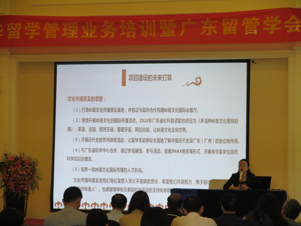 第一个业务培训内容是由广东技术师范学院国际教育学院院长回雁雁作题为“组织在粤留学生体验岭南文化的实践与思考”的专题讲座。她简要介绍了近几年与省内高校合作共同举办在粤外国留学生体验岭南文化的系列活动,并提出了构建岭南文化国际会客厅、拍摄多语言岭南文化宣传视频等计划。
