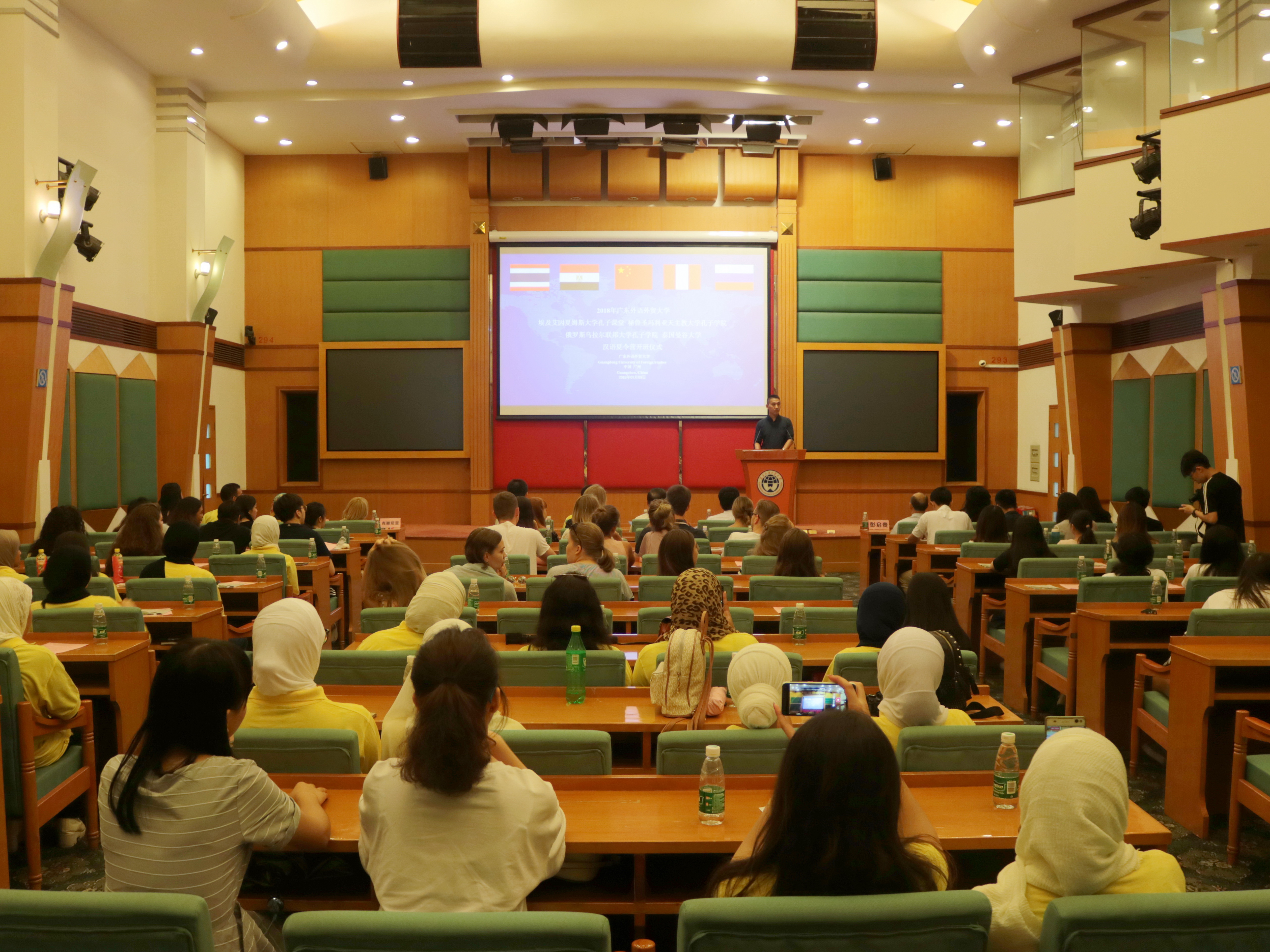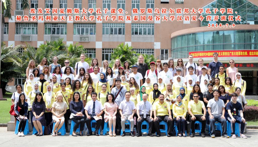 2018年7月9日上午,埃及艾因夏姆斯大学孔子课堂、俄罗斯乌拉尔联邦大学孔子学院、秘鲁圣玛利亚天主教大学孔子学院和泰国曼谷大学汉语夏令营开班仪式在我校行政楼国际会议厅举行。本次夏令营迎来了四所友好院校的近80名海外师生参加。