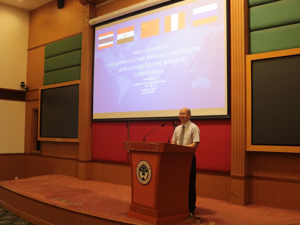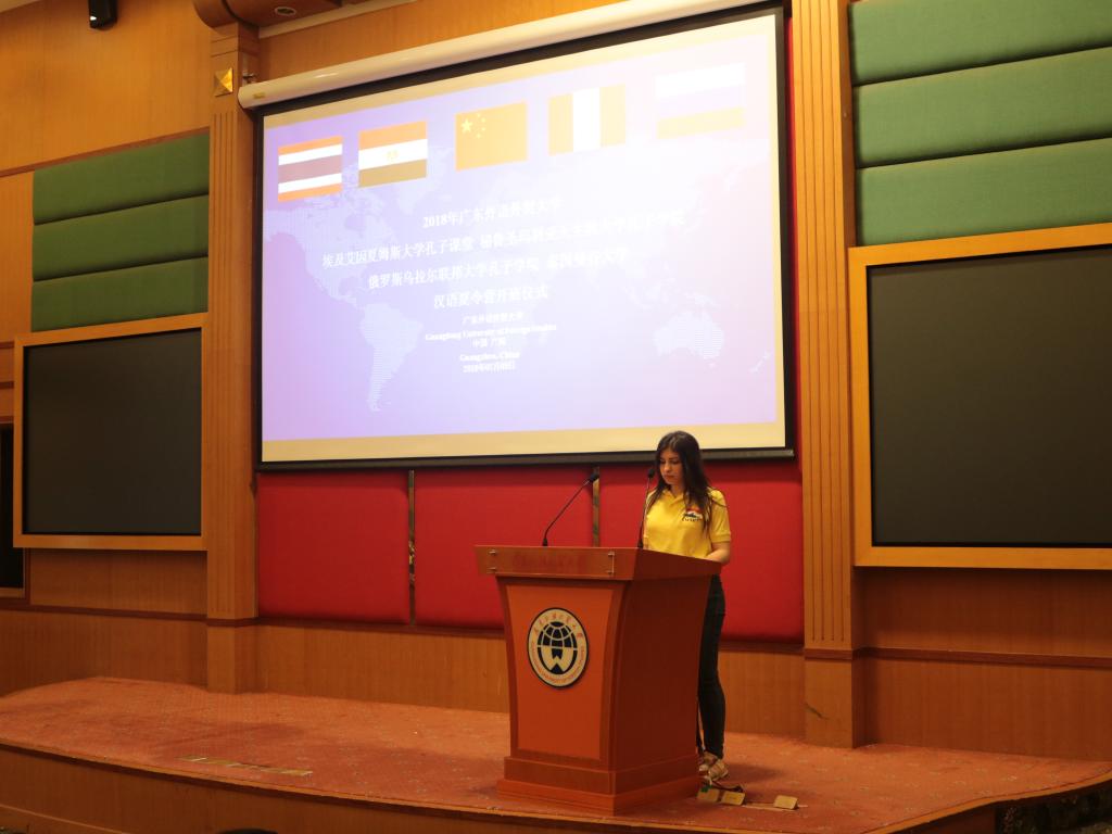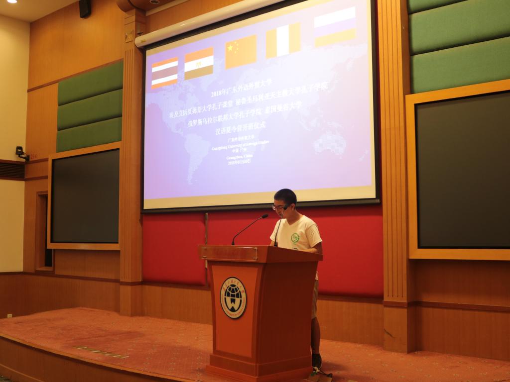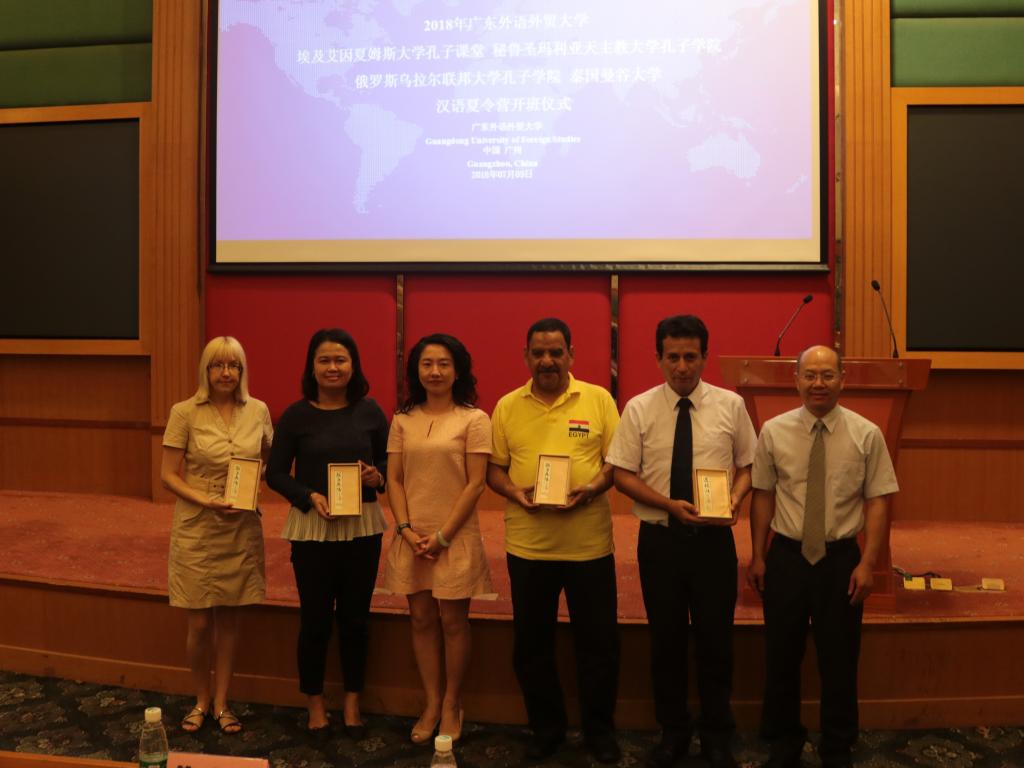 广东外语外贸大学副校长焦方太,国际合作与交流处副处长吴俊峰,留学生教育学院副院长吴艳,秘鲁圣玛利亚天主教大学孔子学院中方院长彭启贵,埃及艾因夏姆斯大学孔子课堂领队老师马基迪、艾麦妮、何伟,俄罗斯乌拉尔联邦大学孔子学院领队老师克谢尼亚及泰国曼谷大学领队老师赞亚出席了开营仪式。