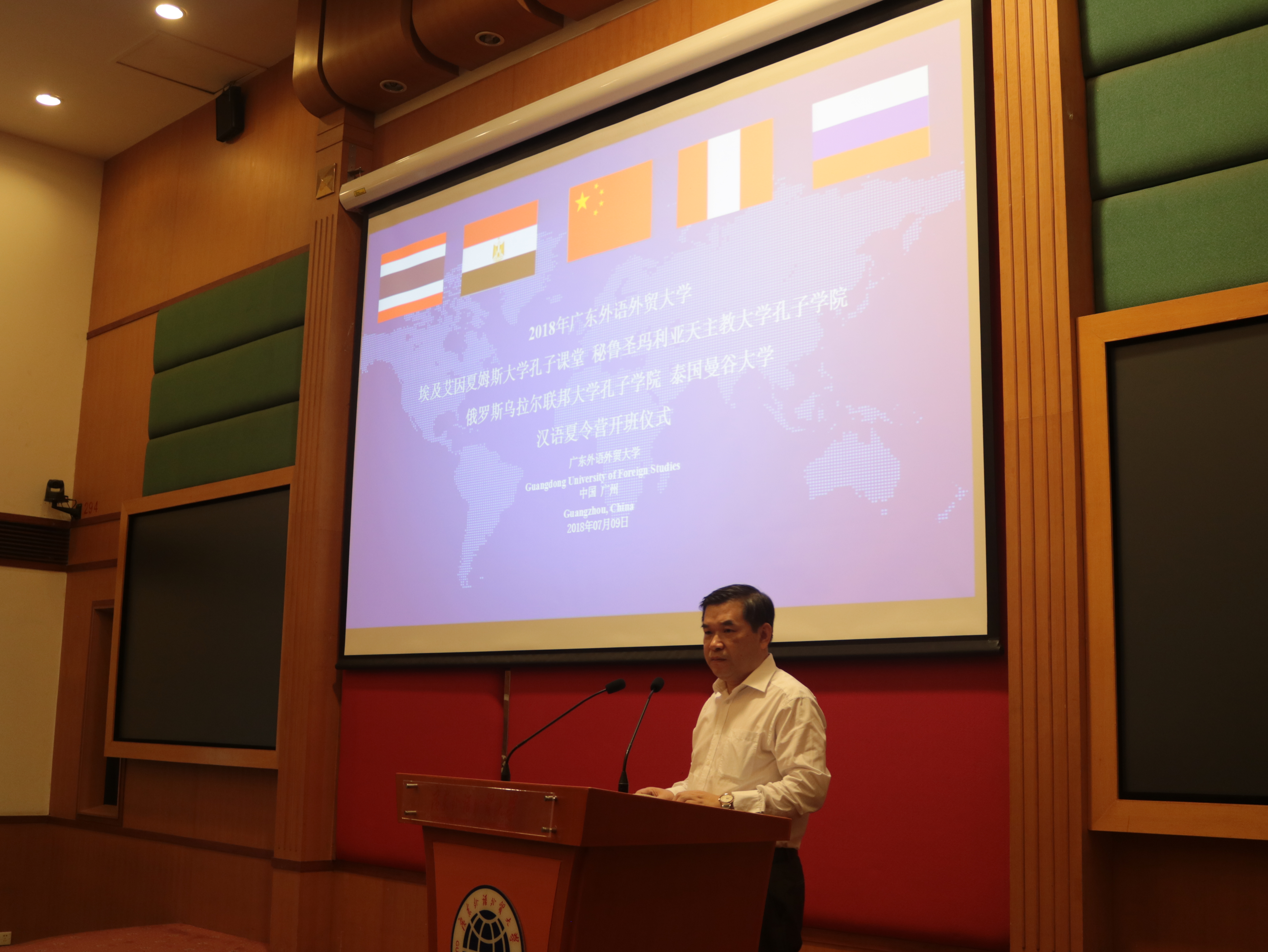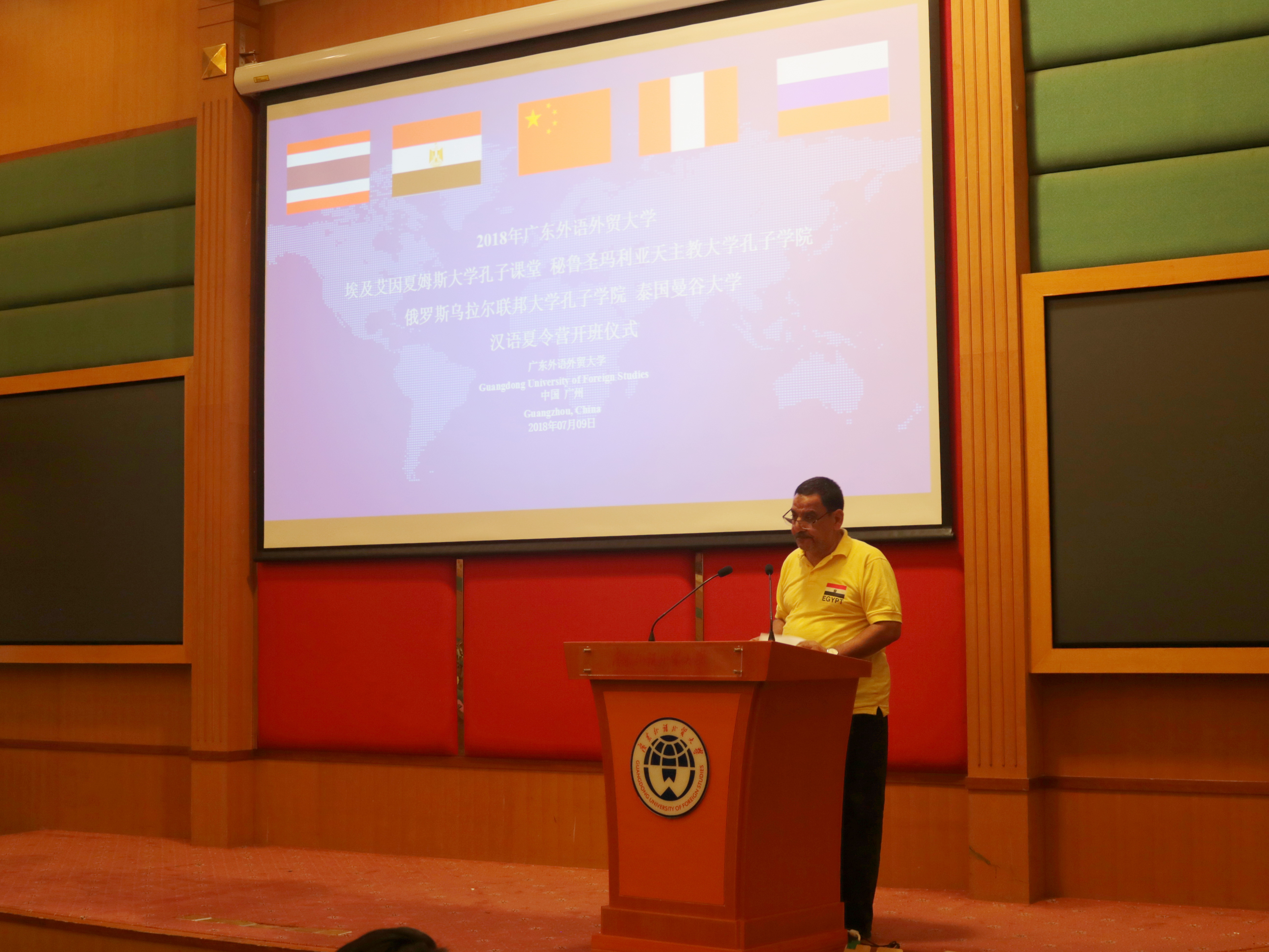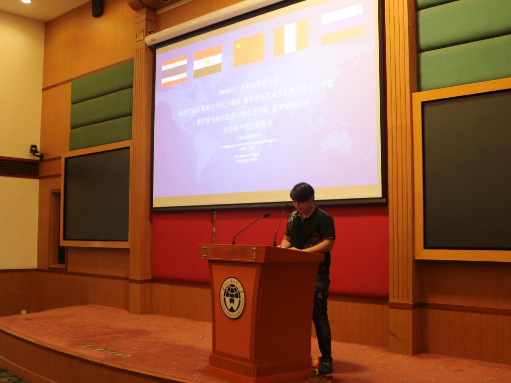 广东外语外贸大学副校长焦方太,国际合作与交流处副处长吴俊峰,留学生教育学院副院长吴艳,秘鲁圣玛利亚天主教大学孔子学院中方院长彭启贵,埃及艾因夏姆斯大学孔子课堂领队老师马基迪、艾麦妮、何伟,俄罗斯乌拉尔联邦大学孔子学院领队老师克谢尼亚及泰国曼谷大学领队老师赞亚出席了开营仪式。