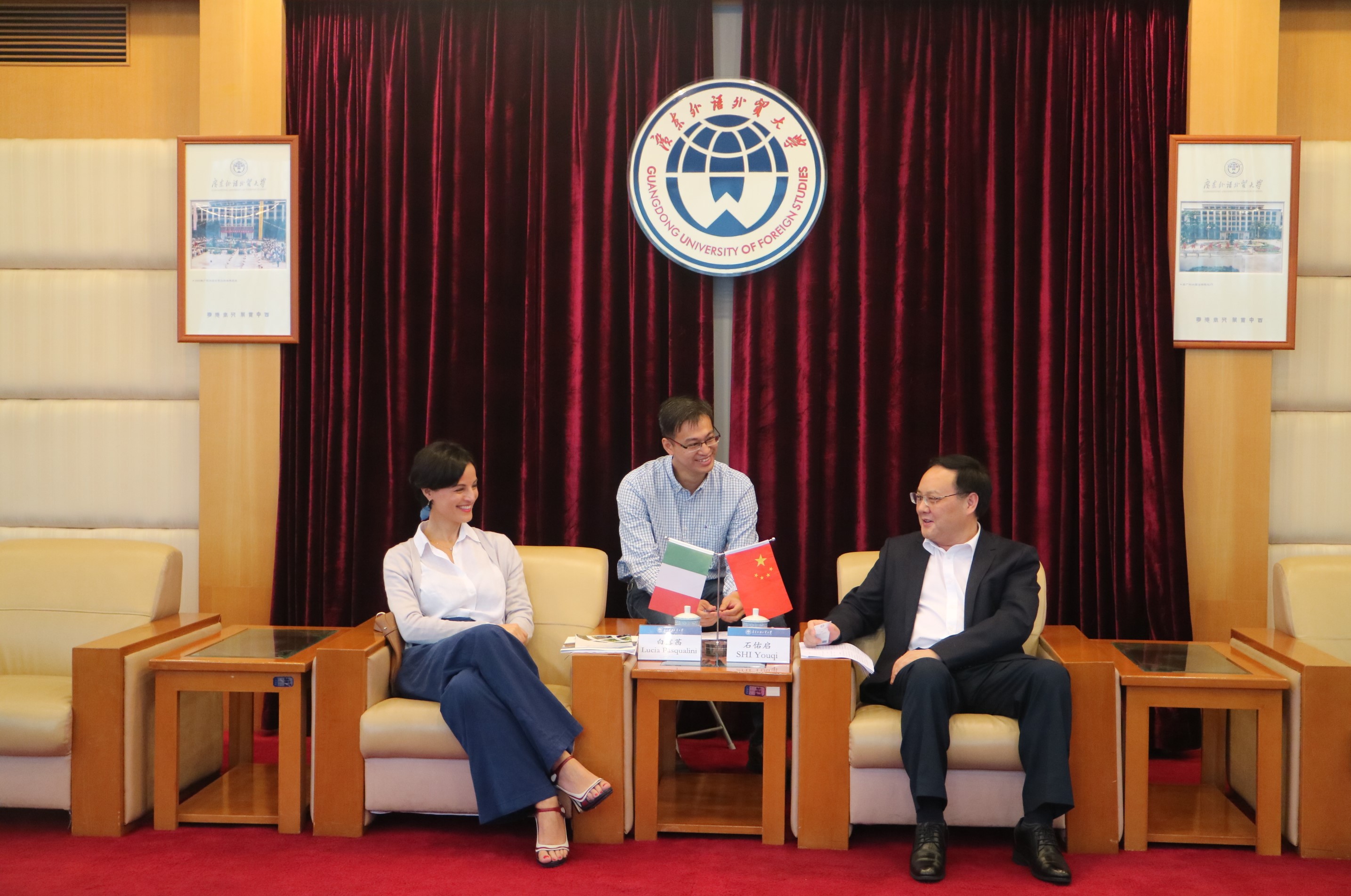 本网讯 10月15日,新任意大利驻穗总领事白露茜(Lucia Pasqualini)来访,我校校长石佑启在北校区行政楼迎宾厅会见来宾,双方就我校意大利语专业建设、人才培养、意大利语言文化周等进行交流。