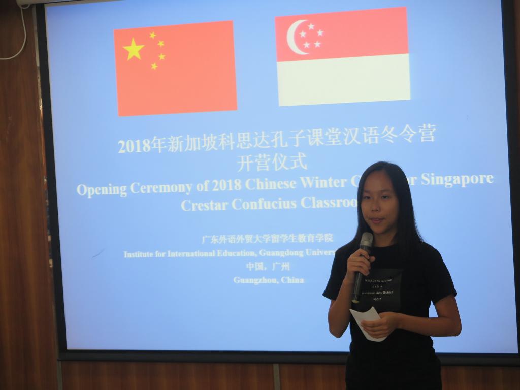 留学生教育学院办公室主任周泉首先致辞。她对同学们的到来表示热烈地欢迎,并简要介绍了广东外语外贸大学及留学生教育学院的国际化办学特色、课程设置、各类奖学金以及特色学生活动。她希望新加坡师生能够通过广州这个窗口去深入了解中国及中华文化,探寻祖辈与中国的联结,学好中文,讲好中国故事。