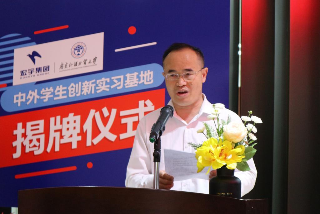 首先,经贸学院副院长肖奎喜致辞。他表示广外与宏宇集团双方共建的实习基地将有利于校企间相互促进,共同发展,接下来希望双方优势互补,加强合作,实现共赢。
