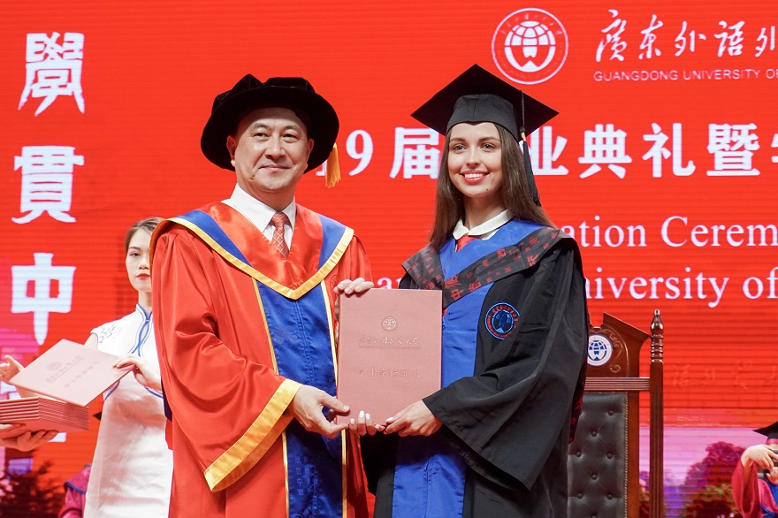 毕业生代表、我院乌兹别克斯坦留学生巴兹克表示,高度国际化的校园文化孕育出“明德尚行,学贯中西”的广外人。课堂上,老师谆谆教诲让他们学到了知识和中国文化中最深刻的做人道理;课堂外,丰富多彩的活动更是让他们大开眼界,祝愿大家怀着对这个世界最大的善意继续前行,虽前路荆棘,但不忘初心,方得始终。