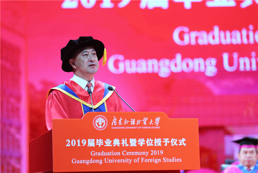 隋广军在致辞中代表学校全体师生员工,代表在外学习的石佑启校长,向全体毕业生及其家人致以最热烈的祝贺。本届毕业生是学校全面推行学分制管理的第一届学生,亲身参与、见证和推动了学校的进步和革新。他带领毕业生回忆了在广外的求学时光,分享了三个故事。