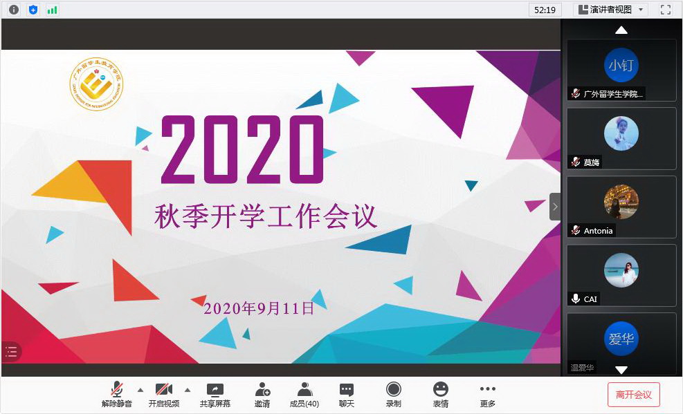 9月11日下午,学院进行了首次线上开学典礼。院长蔡红热情欢迎全体外国留学生,鼓励大家坚定信念、共同应对和度过这段艰难时刻。