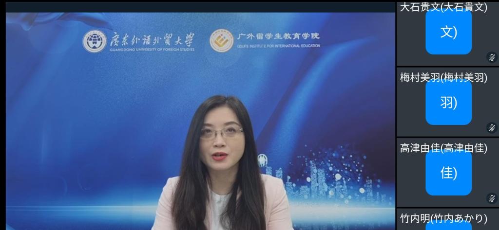 日本共立女子大学李铮强教授在致辞中表示,作为广东外语外贸大学的重要合作伙伴,共立女子大学的师生们每年都会到访广外参加短期交流项目。然而由于疫情原因,线下活动不得已终止,但是本次线上汉语交流营通过汉语学习和文化交流相结合,以及频繁的师生互动,取得了极好的效果,大大地激发了学生们的汉语学习热情。最后,李教授希望疫情结束后能再次带领学员们到广州亲身体验岭南文化。