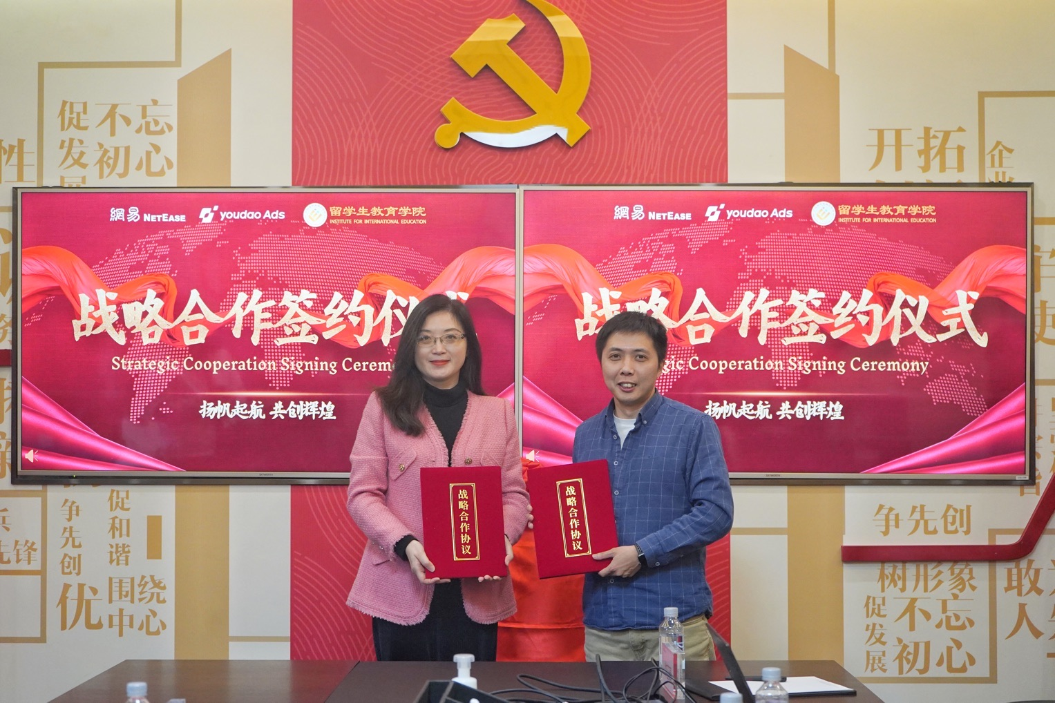 在现场参会师生及网易有道工作人员的见证下,蔡红与冯庆强分别代表广东外语外贸大学留学生教育学院与网易有道信息技术有限公司广州分公司签署了战略合作协议,并为“外国留学生创新实践实习基地”揭牌。