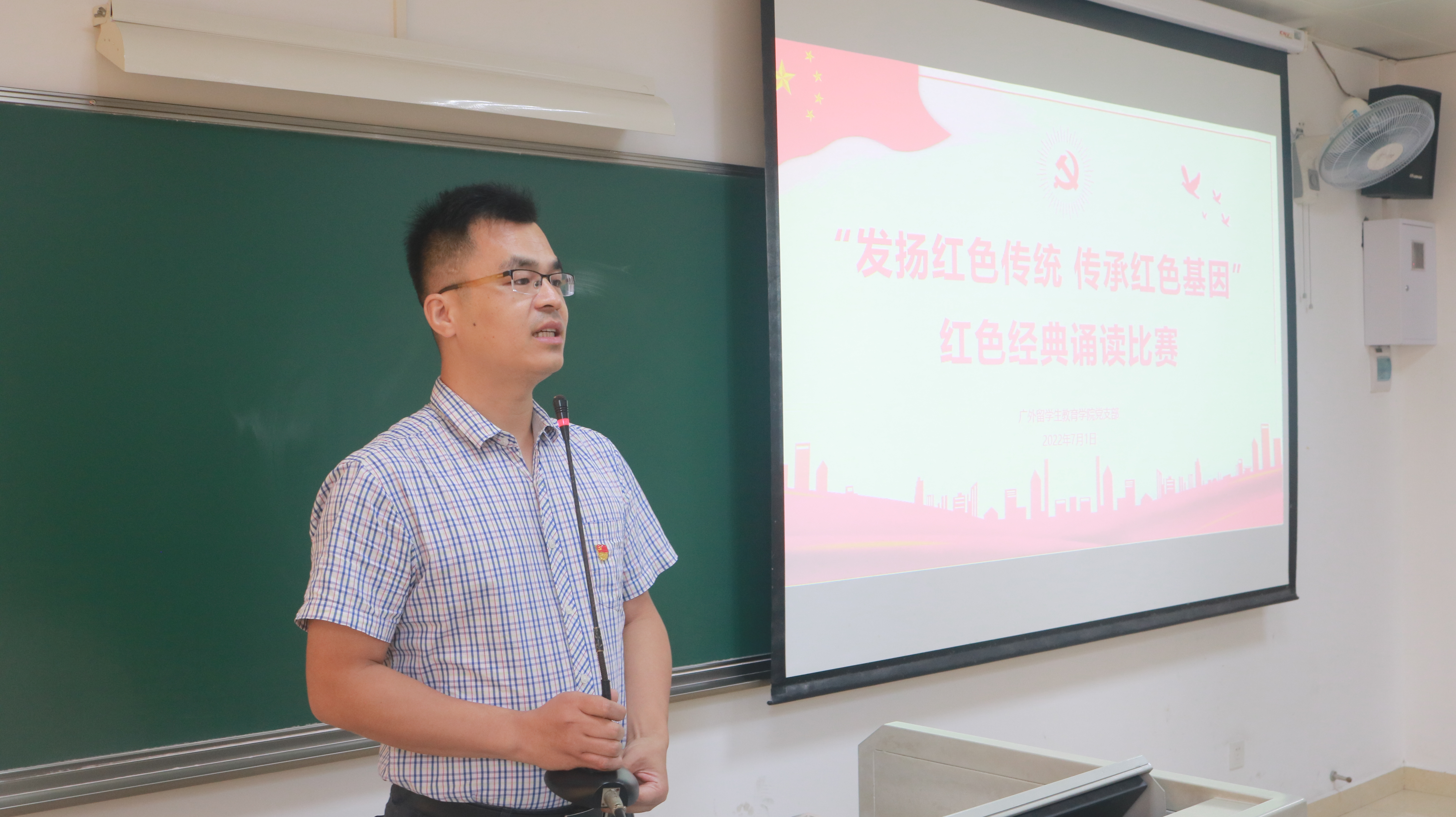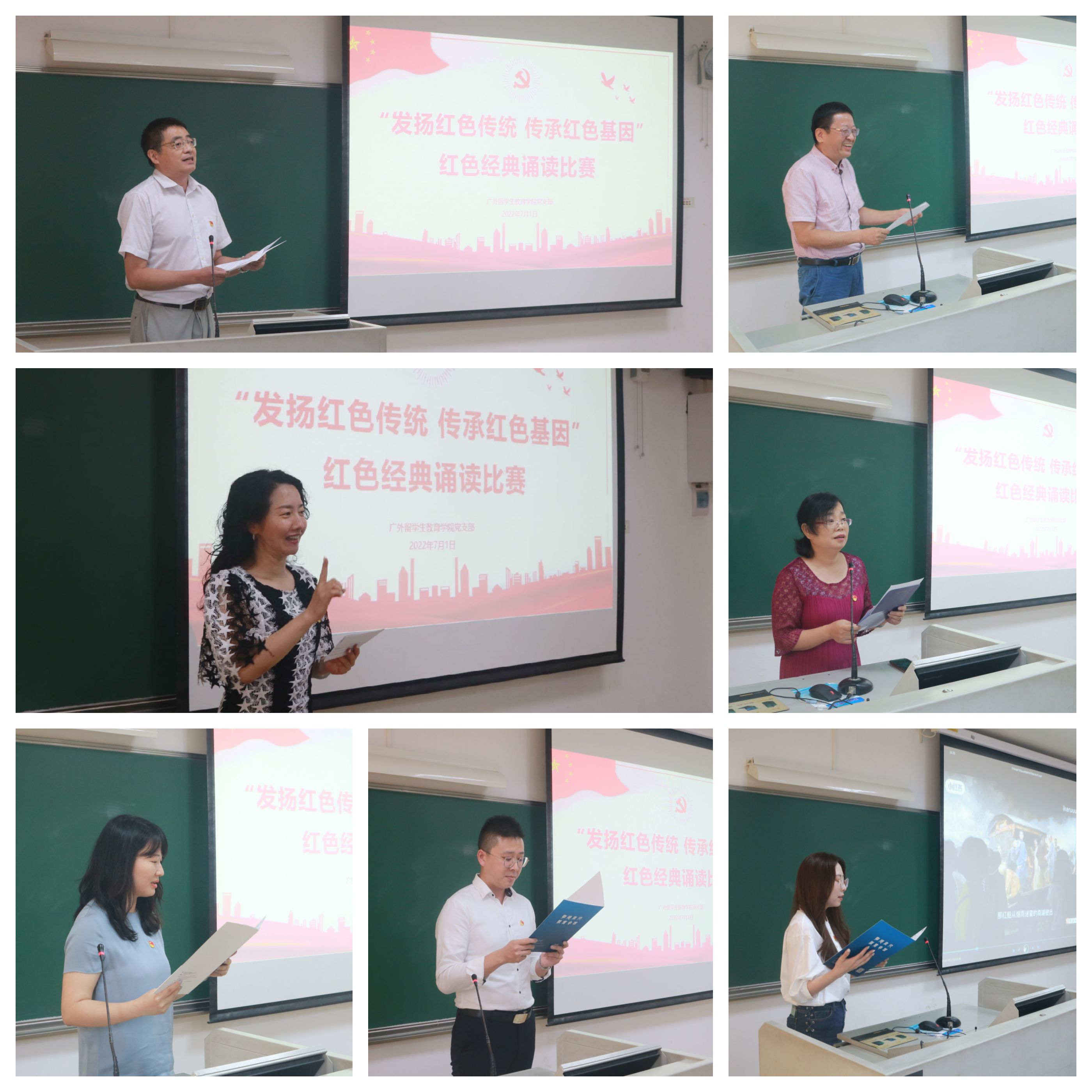 为庆祝建党101周年,迎接党的二十大召开,鼓励广大党员从百年党史中汲取力量和智慧,留学生教育学院党支部于7月1日下午成功举办发扬红色传统 传承红色基因红色经典诵读比赛。校党委组织部副部长刘郎、国际交流党总支六级组织员魏少娟、留学生院党支部书记蔡红和留学生院教师代表王风兰应邀担任本次比赛评委。支部宣传委员王一仟和党员代表赵晶莹主持本次活动。