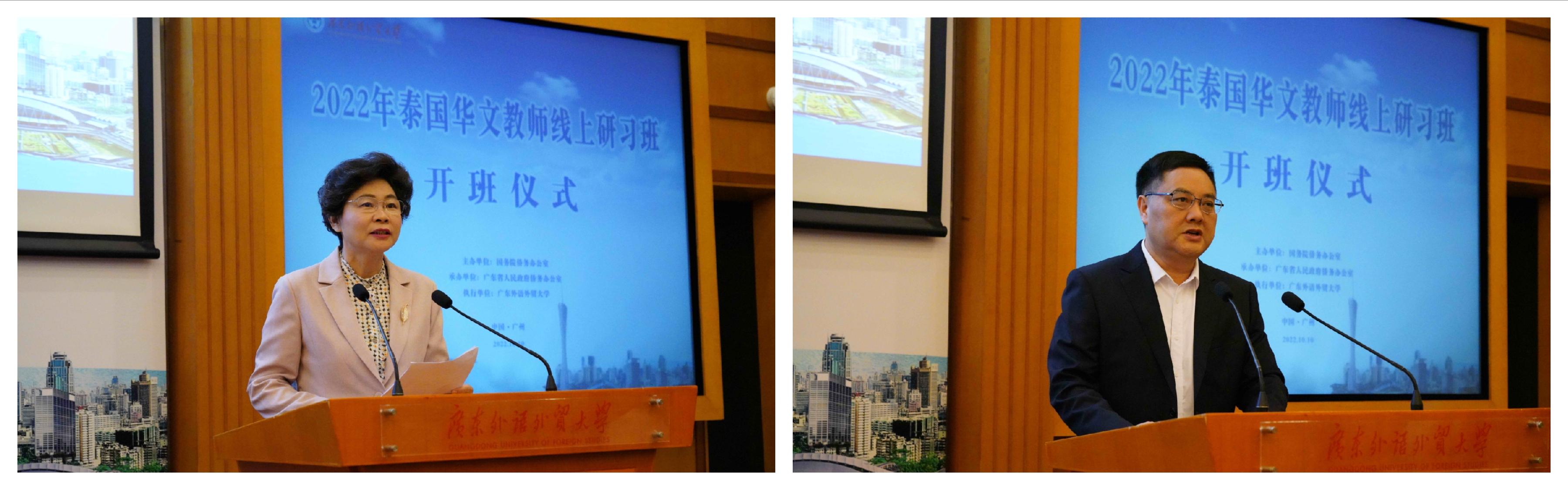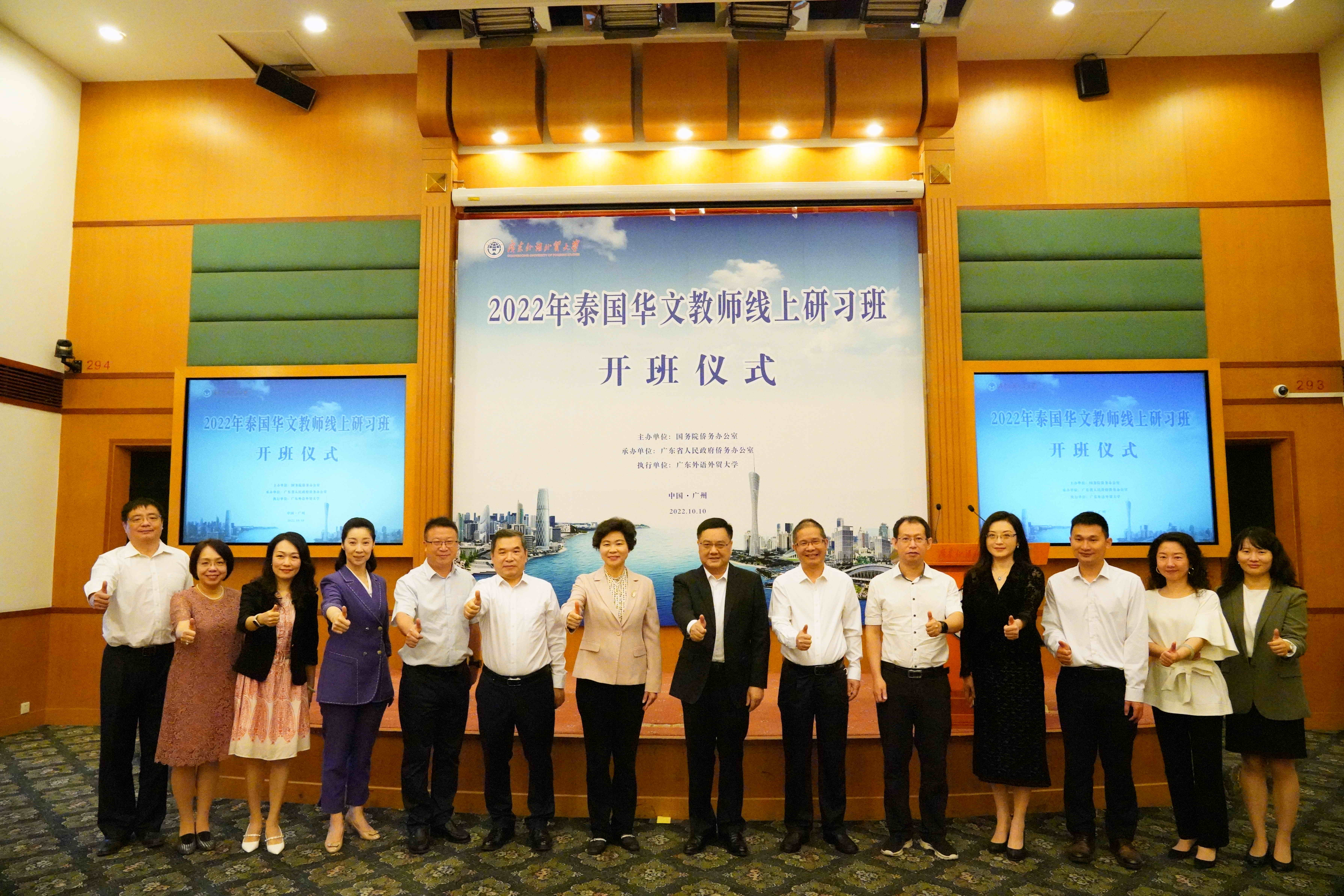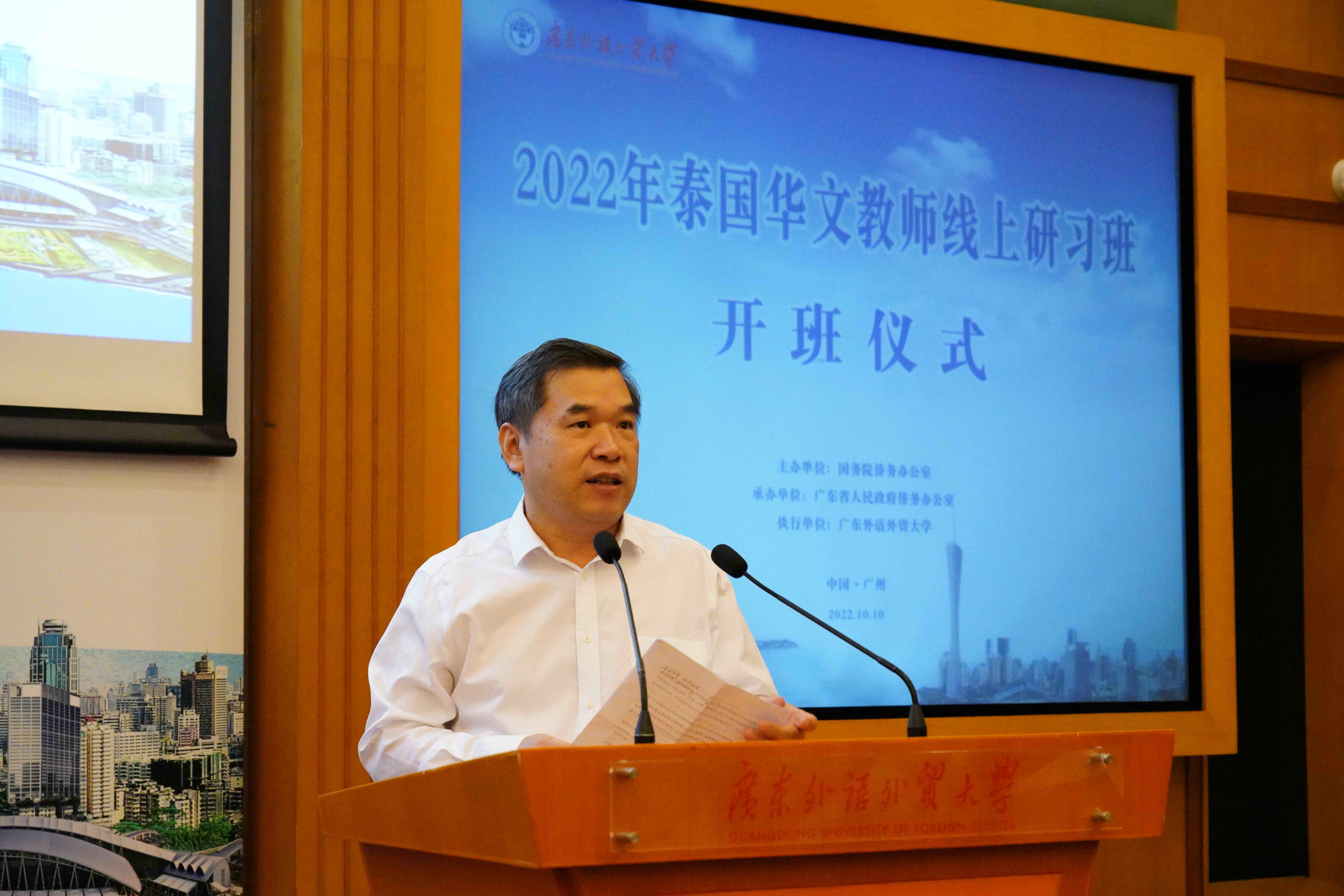 近日,由国务院侨务办公室主办(以下简称“国务院侨办”)、广东省人民政府侨务办公室承办(“广东省侨办”)、广东外语外贸大学(以下简称“广外”)执行的“2022年泰国华文教师线上研习班”在北校区行政楼国际会议厅举行开班仪式。广东省人民政府侨务办公室主任庞国梅,广东外语外贸大学党委书记、校长石佑启,泰中人才交流协会、泰中国际教育联盟秘书长谢华,泰国华文教师公会副主席郭晓辉,广东省人民政府侨务办公室和广东外语外贸大学相关部门同志出席仪式,本项目授课专家和100多位泰国学员在线参加本次活动。开班仪式由广东外语外贸大学副校长焦方太主持。