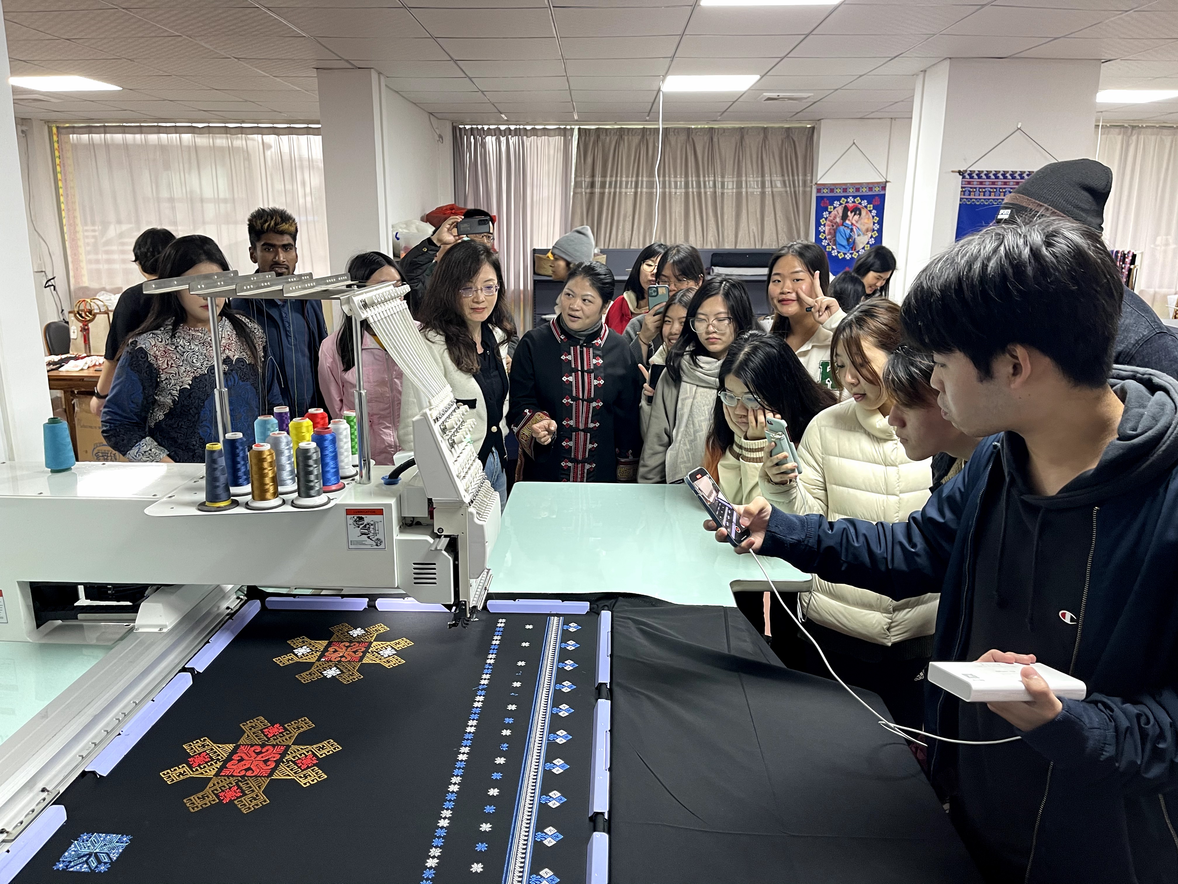 最后一站,留学生参观了乳源非遗文创孵化基地。赵馆长介绍了瑶绣等瑶族非物质文化遗产,并展示各类瑶族文化元素的文创产品。手提包、手绳、耳坠等各类融合瑶族元素的产品图案独特、造型精美,吸引了留学生驻足观看。馆长还带领留学生来到生产作坊观看各类瑶绣织物的生产过程,向留学生们鲜活展示了乳源非遗文创将文化传承与经济发展相结合,产业振兴和文化振兴相结合的特色。