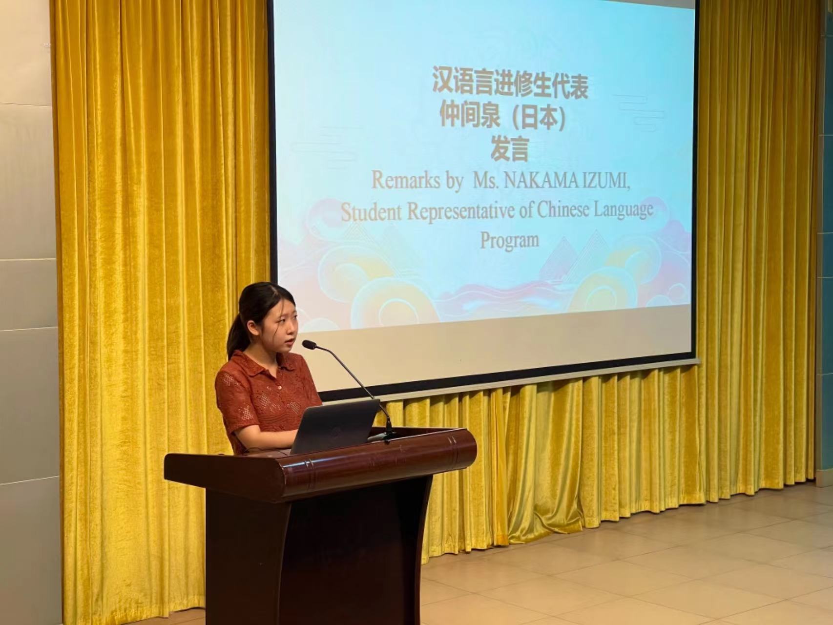 日本籍学生仲间泉代表汉语进修生上台发言