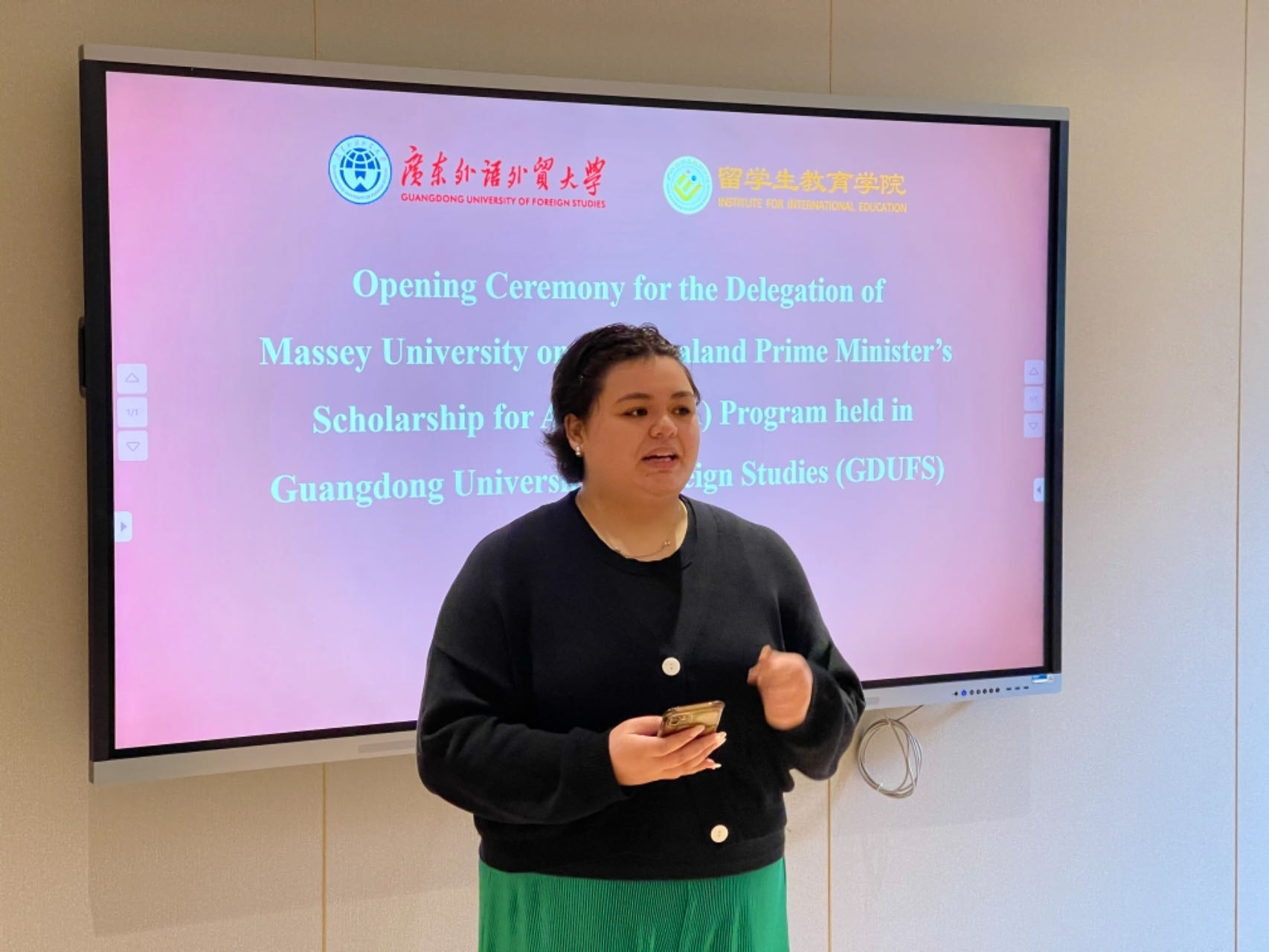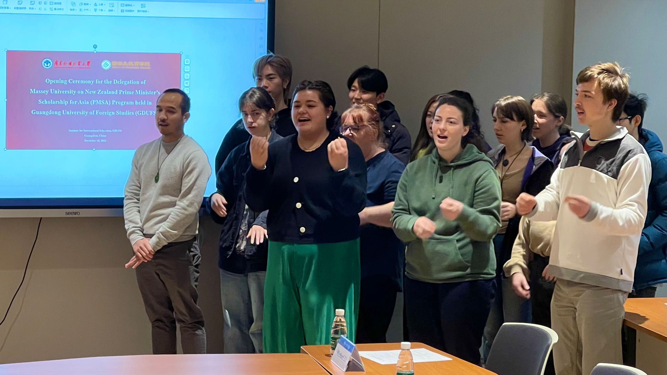 梅西大学学生代表Denae McCready同学在发言中表示,非常期待在广外的学习并参加各类参观交流活动。现场的新西兰同学一起演唱了传统毛利人歌曲,气氛欢快热烈。