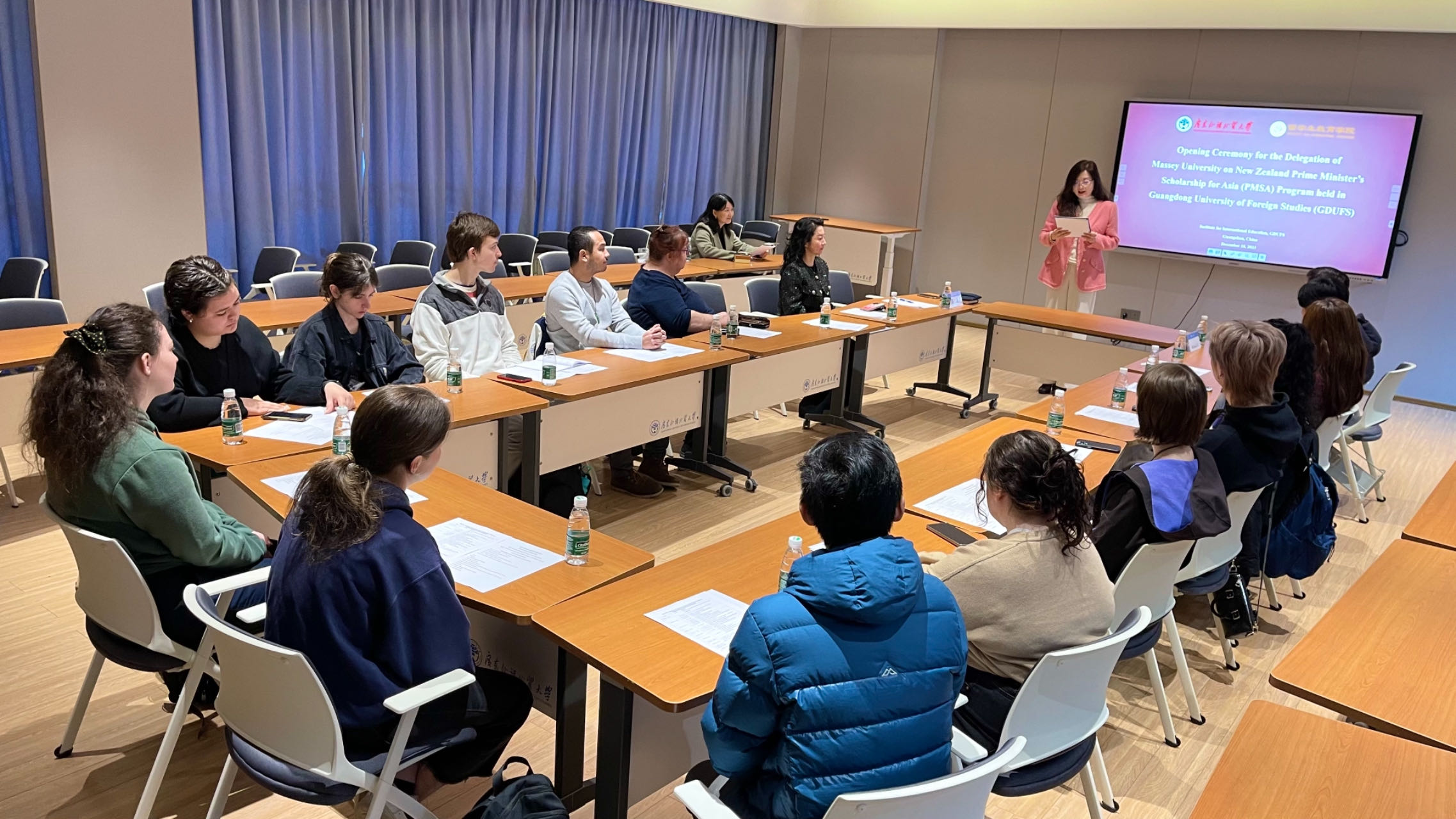 12月18日上午,梅西大学新西兰总理亚洲奖学金项目广东外语外贸大学开班仪式在白云山校区科研楼会议室举行。梅西大学人文学院中文系负责人Michael Li教授, 留学生教育学院院长蔡红、副院长吴艳、招生及项目主管刘平等和14名梅西大学同学参加了开班仪式。仪式由留学生教育学院办公室主任周泉主持。