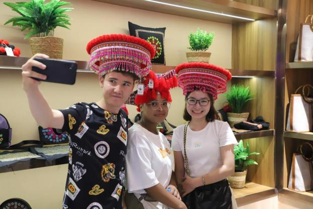 帽子、披肩、首饰、水壶、挂饰、环保袋,第一次接触瑶绣的同学们可以说是爱不释手,纷纷将瑶绣“上身”,看到喜欢的产品便马上抓紧机会“下单”。而来自巴基斯坦的SHAKIR ULLAH(沙克尔)则在瑶绣中看到了中国瑶族文化和巴基斯坦文化的融通之处:“这些瑶绣文创产品让我感到很熟悉,因为在我家乡的服饰、装饰上也有很多类似的图样。我也会把此行的收获写成文章,向巴基斯坦人民介绍中国乳源。”正在攻读工商管理博士学位的他还打算与乳源非遗文创孵化基地合作,将瑶绣文创产品销往巴基斯坦。“我希望在国际文化交流中分享各自的经验,同时寻找互利合作与共同发展的方式。未来,我还将在中国探索更多新事物,向我的同胞分享关于中国人民的一切。”